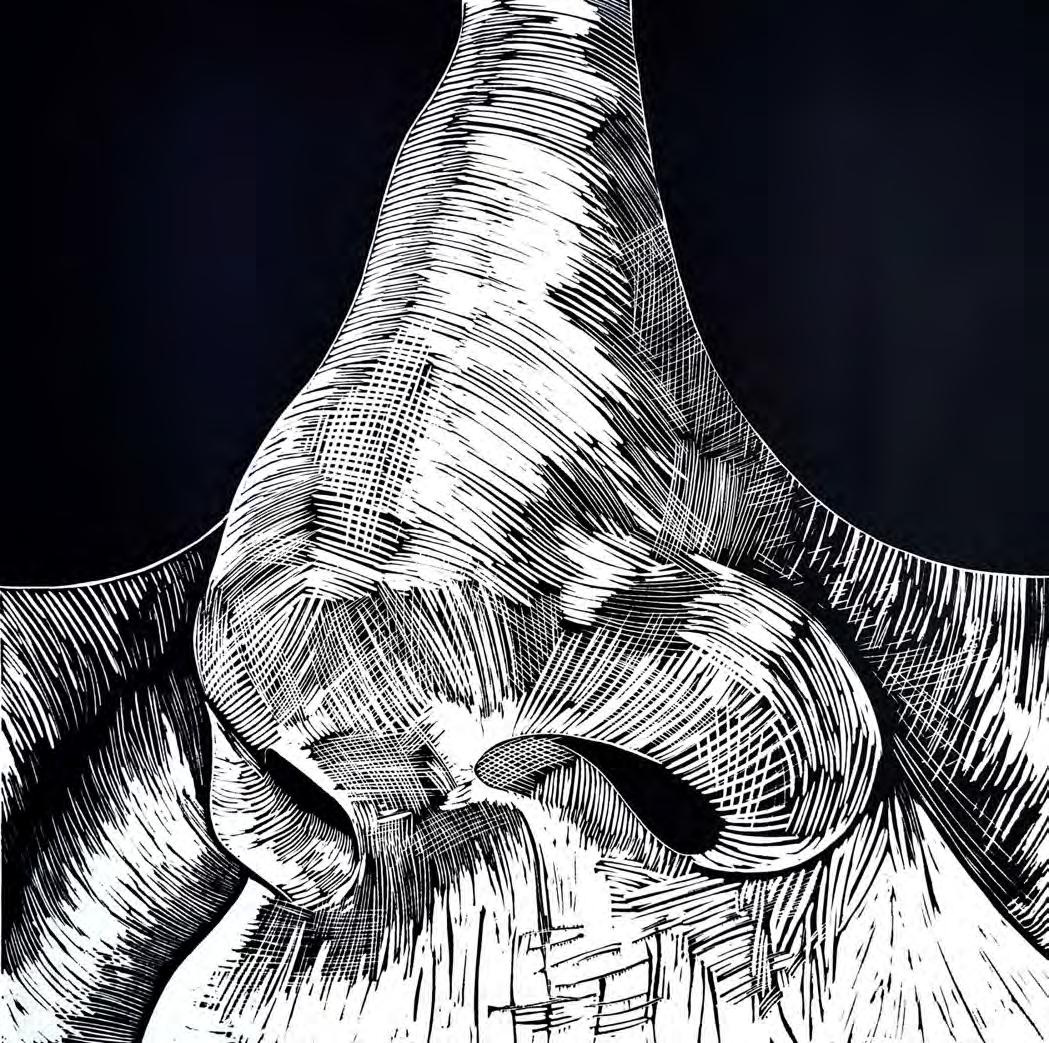 I’m intrigued by the technical processes of traditional printmaking, and the precision and attention to detail it requires. While maintaining these elements of printmaking, I enjoy exploring and searching for different materials and other artmaking techniques to combine harmoniously in my process. This artwork combines drypoint etching and the use of cotton thread to provide a range of texture, while at the same time creating a seamlessness with the paper. Although The businessman represents a symbol of boldness, confidence and power, the cotton and stitching juxtapose a sense of fragility and unravelling. This plays on the notion of first impressions or people’s outer projections, so often masking insecurities, lack of confidence, and inner turmoil. Within this contrast, my aim is to create a sense of harmony or balance between the two.