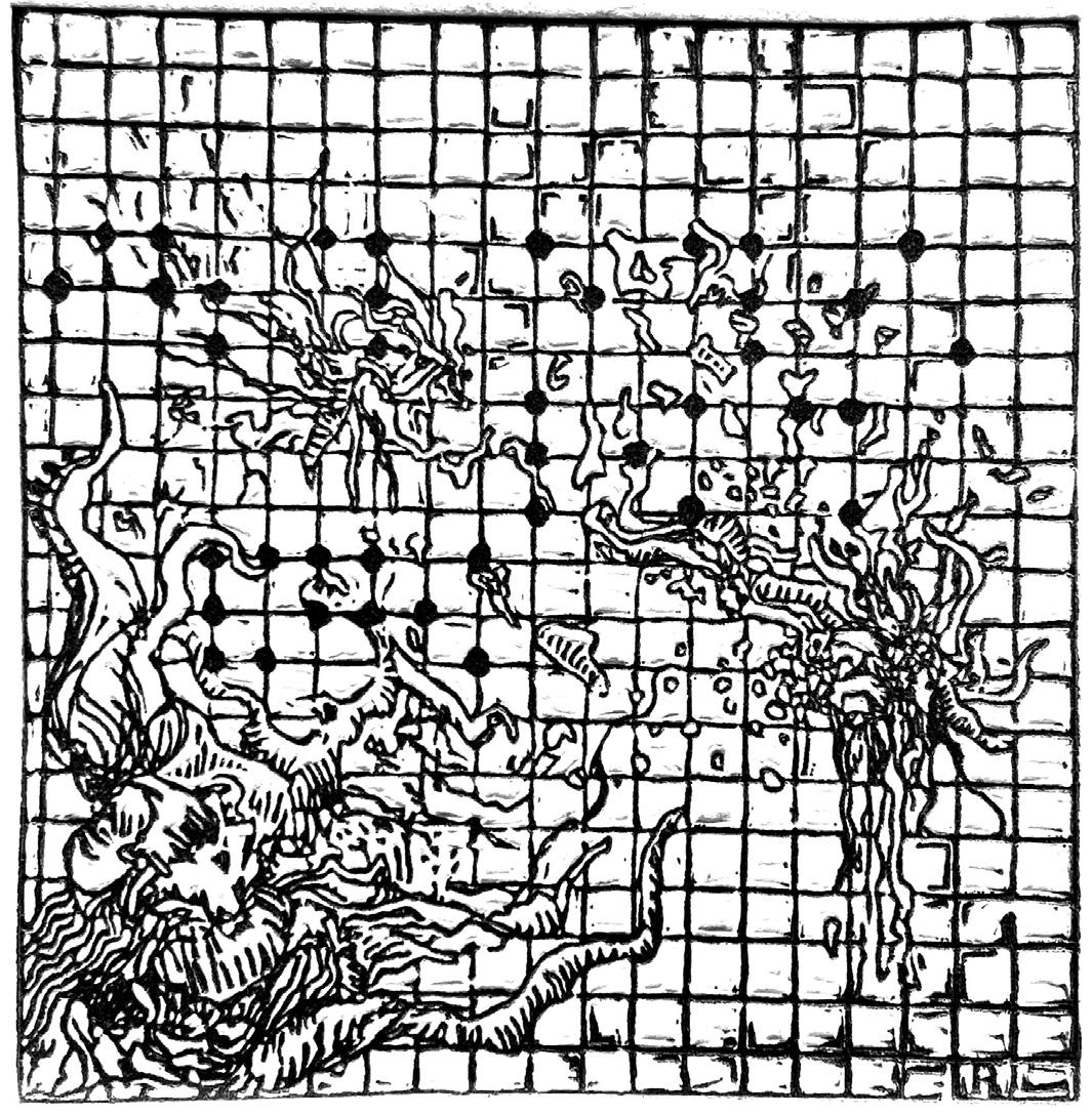 As a child I was always fascinated by thick thorn trees, especially those found on my grandparents’ farm. Many times I got stuck in the thorns, my clothes ripped, and the tree ‘holding on’ to me. The print Holding On shows a circular, zoomed-in perspective of thorn. I have made use of the drypoint technique due to its ability to emphasise linework, strengthening the thorns crisscrossing over and among each other.