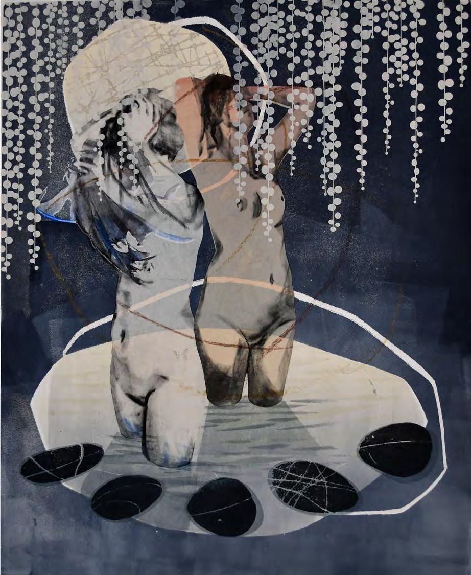 In these new mixed media pieces, my aim is to draw parallels between the themes in Bible stories about women and female sexuality, and continued attitudes towards women in our modern society. Partially concealed subtexts are implied by the visual elements in the compositions. The female figure in these works is intended to question the oppositional gaze of the voyeur. Is she the protagonist or the victim? Is she the temptress or the martyr? Women are seen not only as victims of random forces of violence or sexual harassment, but also as someone who invites her own fate.