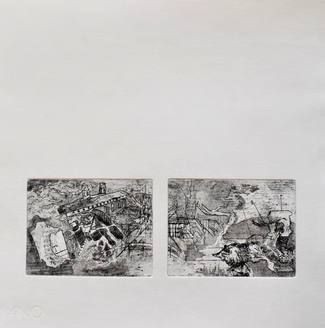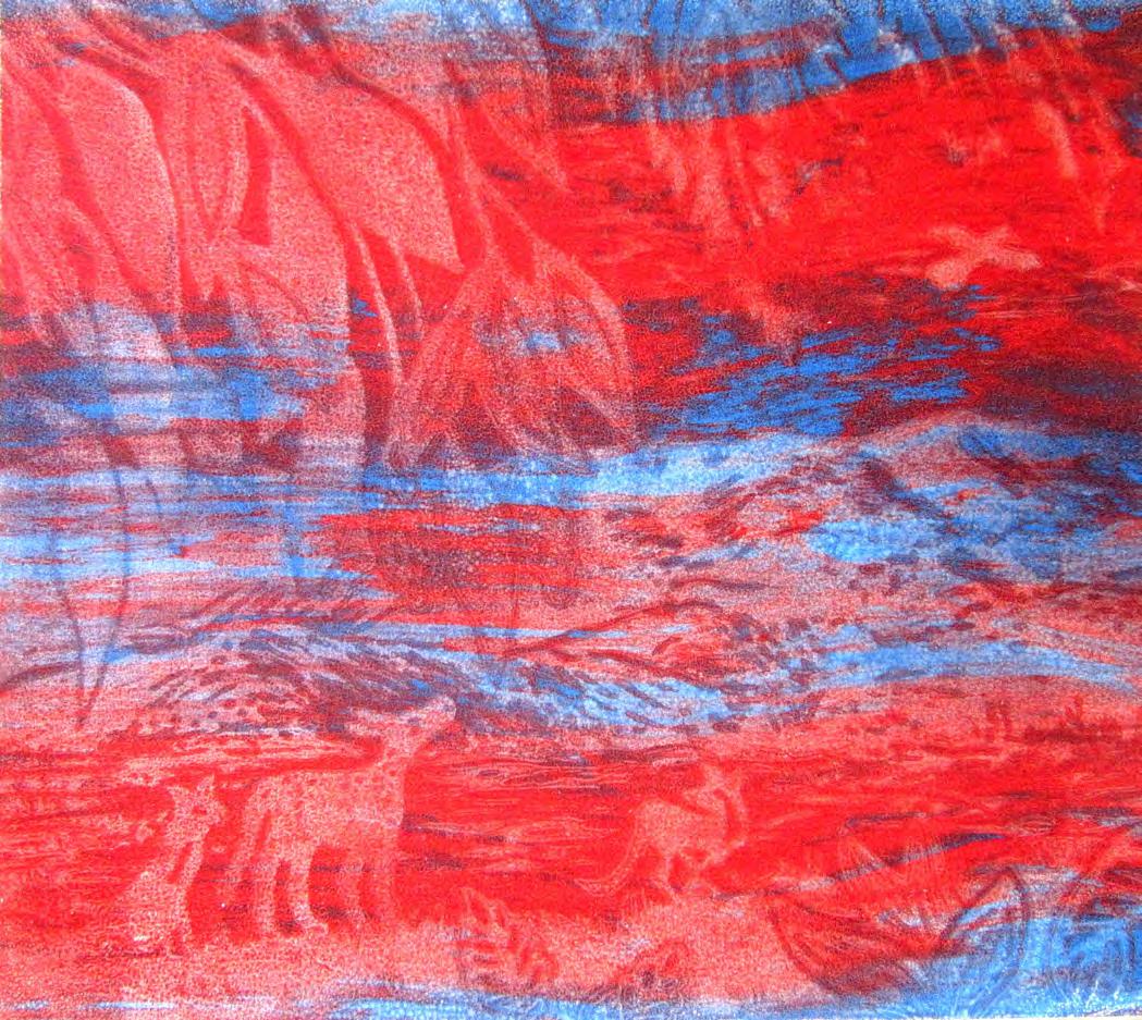 In my ongoing work, I research the ongoing changes in the seemingly static seen and unseen world of rocks, rock-formations, outcrops, and hidden waterways. Fire and water play an important role in these events. For example, masses of fluids, usually water, go hand-in-hand with the fracturing processes. The printing marks in these works were inspired by actual marks on rockfaces, riverbeds, or rocky outcrops that I photographed as source imagery.