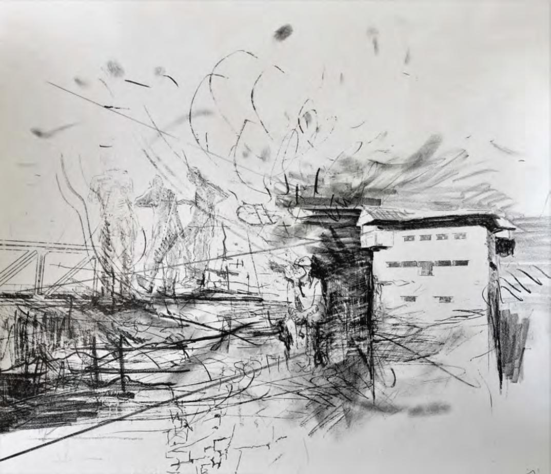 I’m most drawn to stone lithography. I appreciate lithography’s technical challenges, its tactile elements of stone, grease, and water, and how this ancient printmaking technique complements my contemporary passion for drawing. I use the sensitive mark-making qualities of line and tone specific to the lithographic technique to explore indefinable spaces and the sense of comfortable yet temporary dwellings to create an eerie awareness of light, shadow, and simply drawn objects.