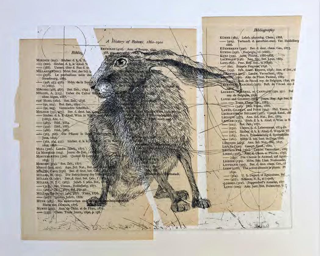 I have a deep affinity for animals and find them a compelling subject in my art, particularly in respect of their symbolism on a cultural or spiritual level. Through my current etchings I explore the interconnectivity between the natural world and science – how forms and patterns in nature can be modelled mathematically i.e., the Geometry of Nature. This theme is represented using geometric lines in my images, supported by torn pages from old science textbooks.