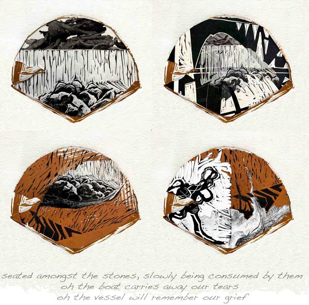 I work primarily in ceramics, collage, and printmaking, and particularly enjoy finding ways to combine all three disciplines. My ceramic and reduction lino pieces for this exhibition have been inspired by sketchbooks filled with my dreamy drawings during the months of Lockdown last year. Working through them a year later, I have been struck by how those small doodles carried the weight of so many thoughts and feelings from last year – watching nature reclaim urban spaces, living a solitary life quite happily, the unexplainable pain of losing loved ones and not being able to give and receive comfort in person.