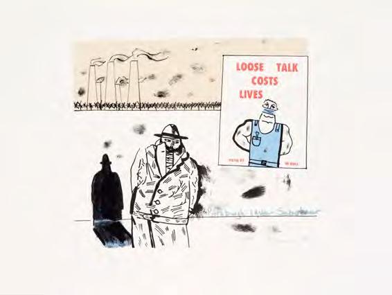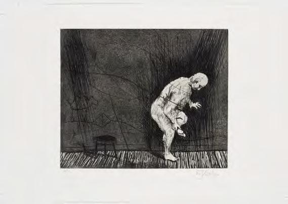 In this suite of 8 hand-coloured etchings, Hodgins elaborates his silent movie, opening with scantily clad lovers in a dance hall and moving through the ensuing drama spelt out in images and subtitles like ‘Discovered’, ‘Tell me the truth’, ‘a shot in silence’ until finally, ‘The End’. In each vignette a dark force or cloaked maternal figure observes the unfolding drama between the lovers and the cuckolded man in his pinstripe suit. With his delicious wit and sense of play, Hodgins has brought his life-long passion for theatre and his wicked sense of humour to bear on the foibles of everyday life in this expressive and amusing suite of etchings.