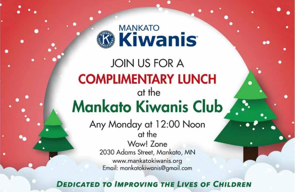 The Kiwanis Club holds weekly meetings every Monday at 12:05 p.m. at the Wow! Zone at 2030 Adams Street in Mankato, Minnesota.