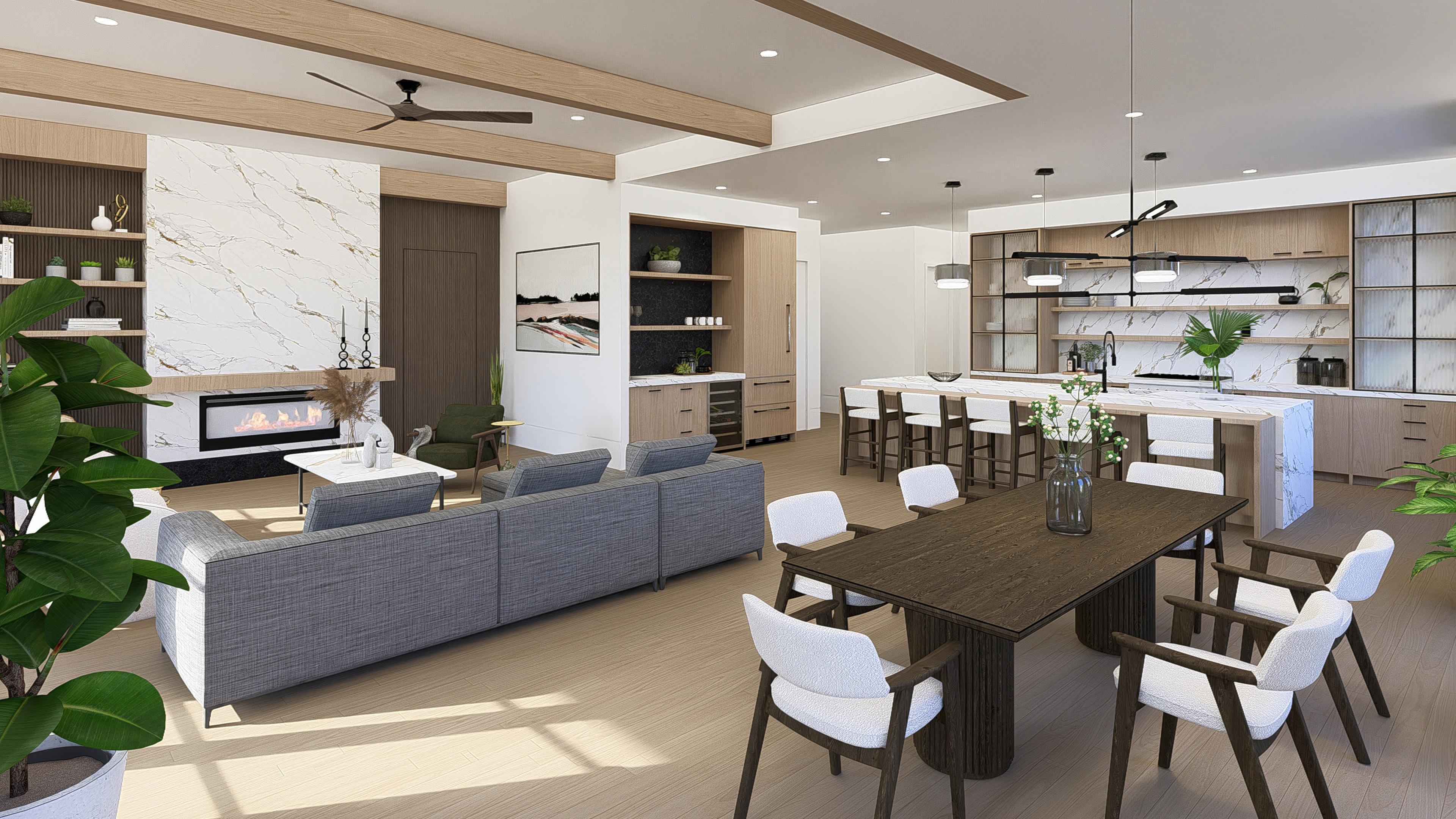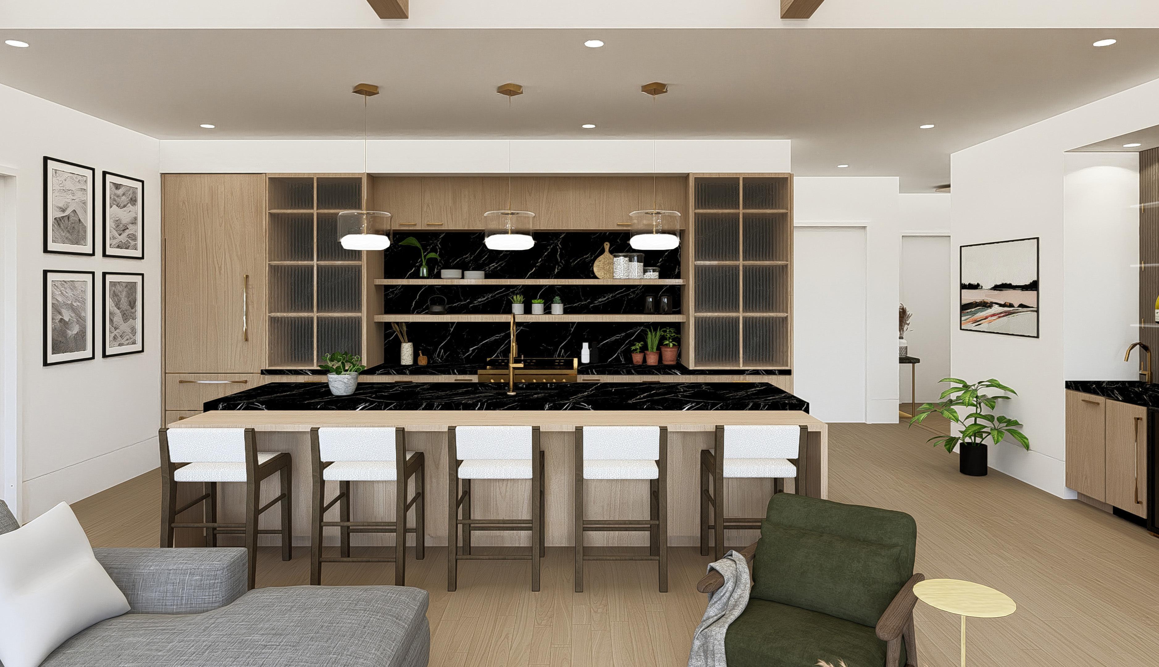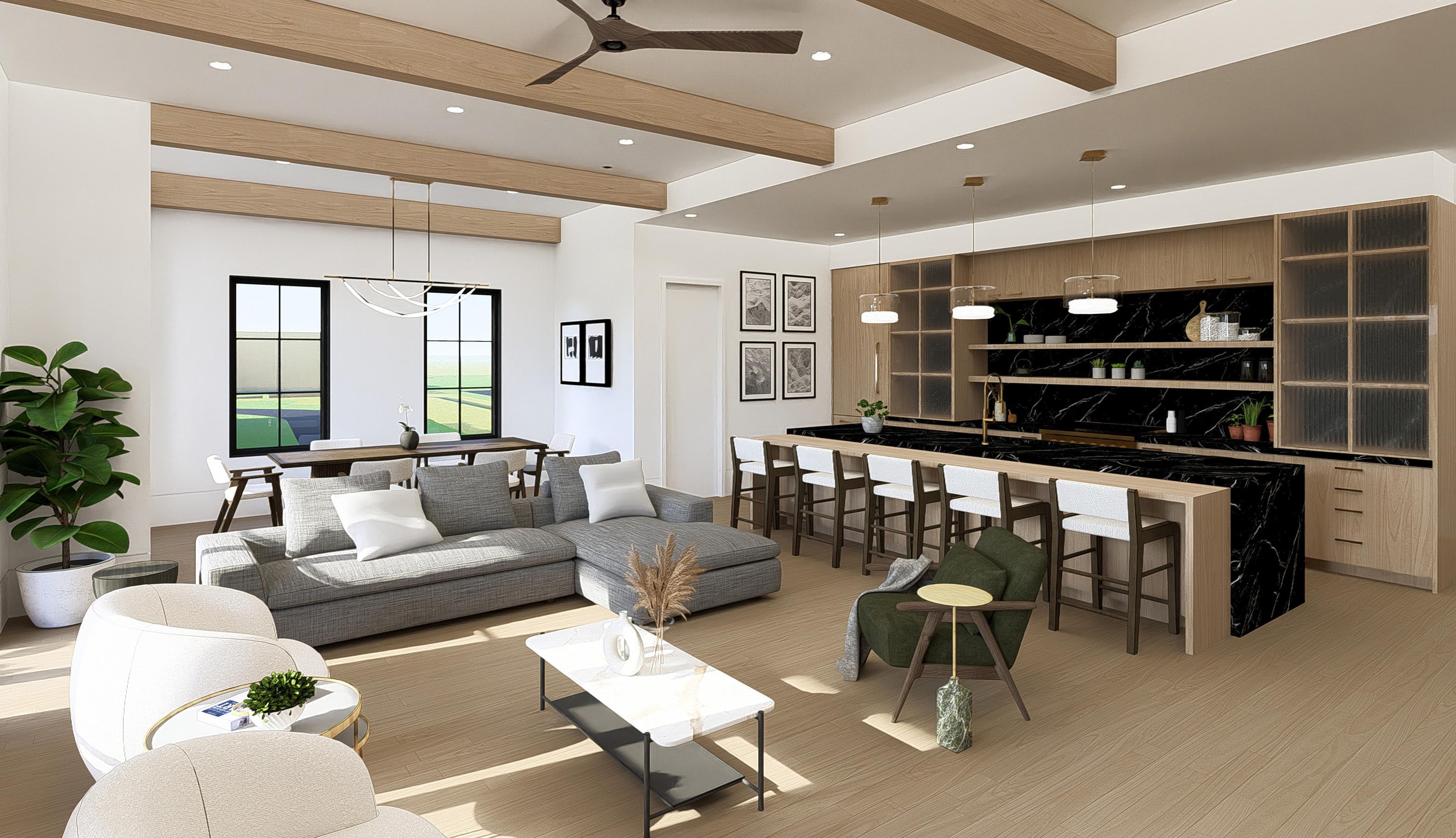 The modern aesthetic, rooted in early-mid-20th century design, is characterized by simple form and function, use of natural materials, and a neutral color palette. A focus on simplicity, clean lines, and functionality will create a minimalistic yet inviting space. Long and low design profiles, geometric patterns, and curved shapes will dominate the living and kitchen areas. The open floor plan and copious amounts of natural light help keep the space airy and open.