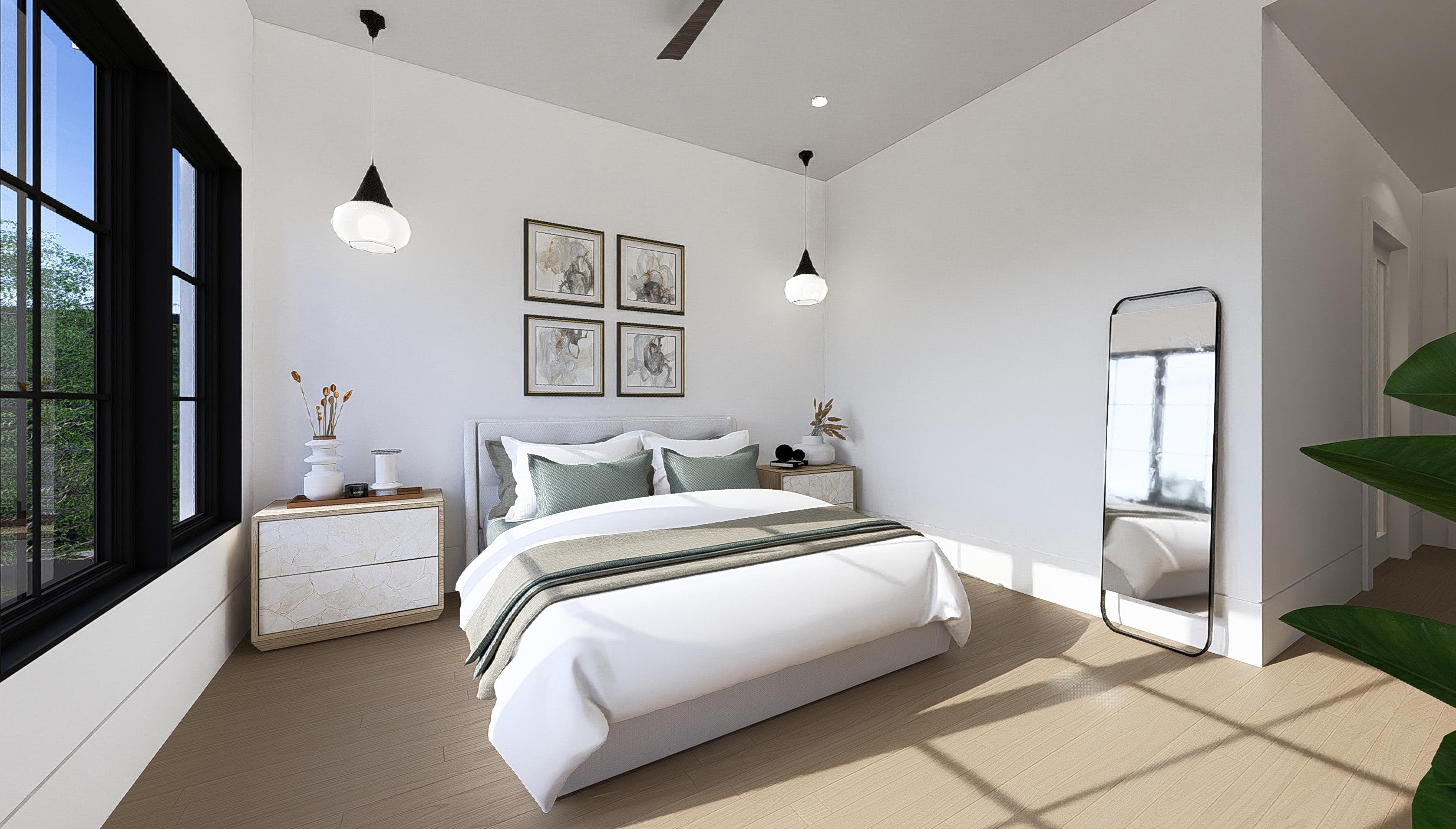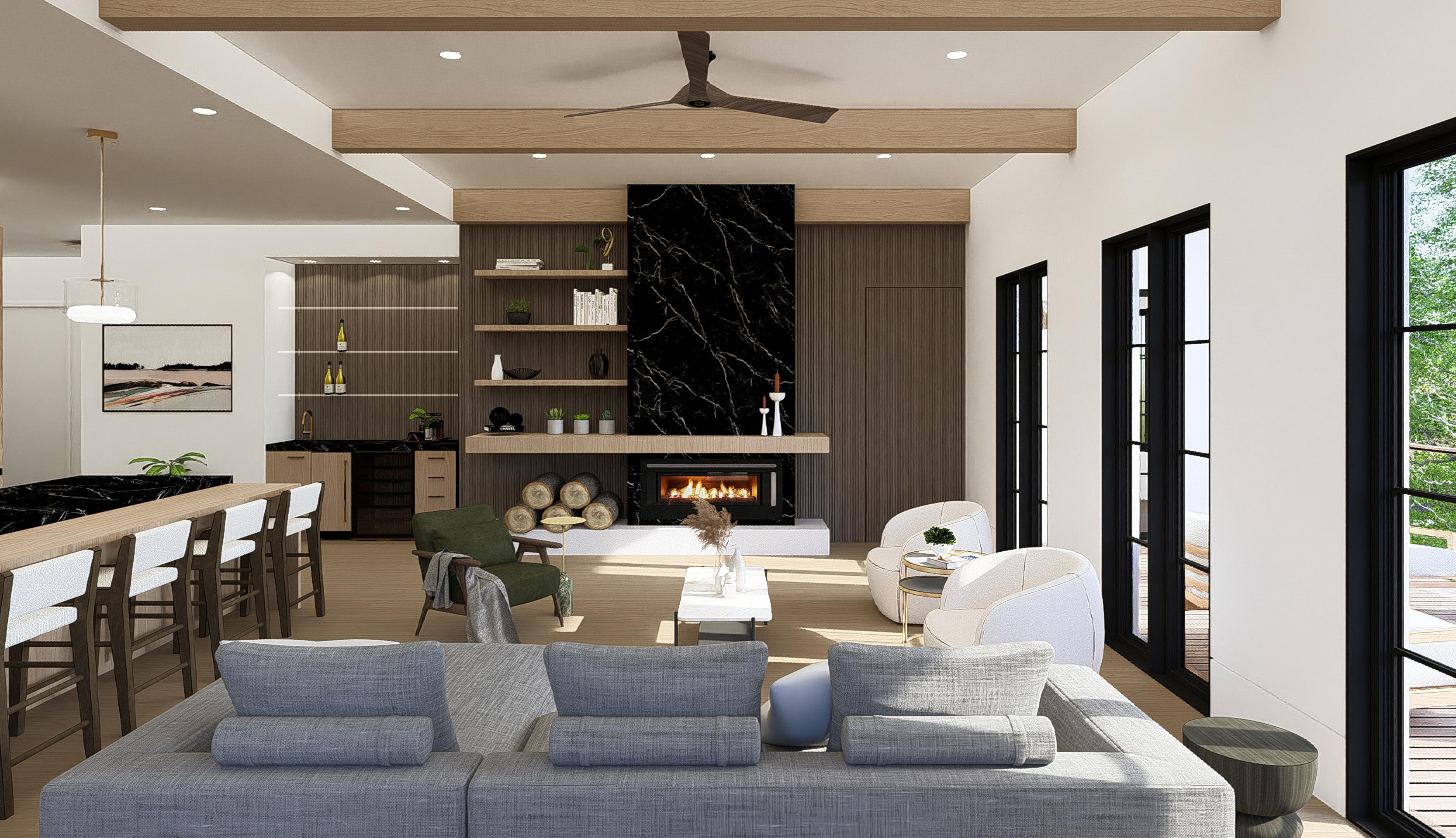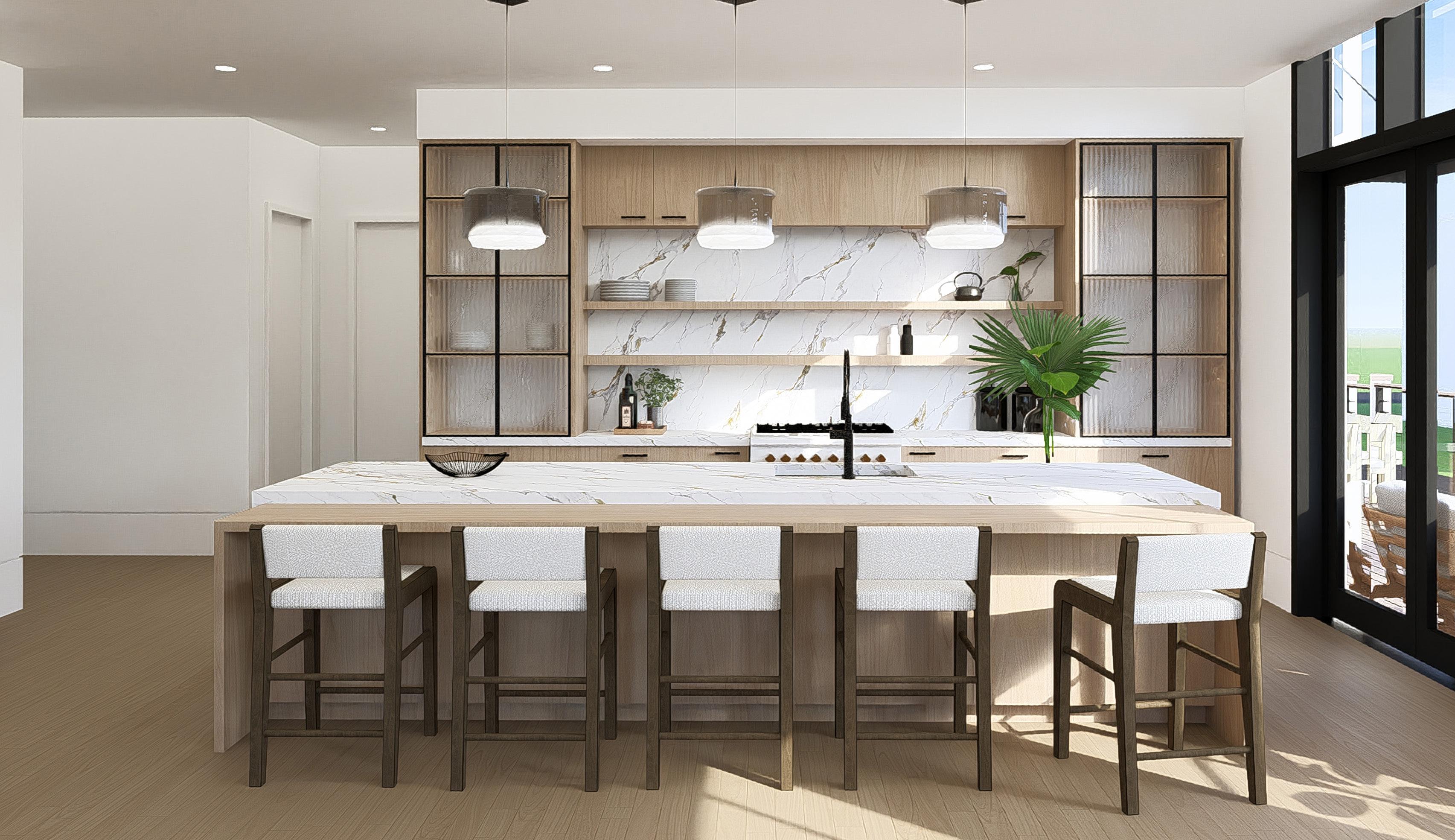 The modern aesthetic, rooted in early-mid-20th century design, is characterized by simple form and function, use of natural materials, and a neutral color palette. A focus on simplicity, clean lines, and functionality will create a minimalistic yet inviting space. Long and low design profiles, geometric patterns, and curved shapes will dominate the living and kitchen areas. The open floor plan and copious amounts of natural light help keep the space airy and open.