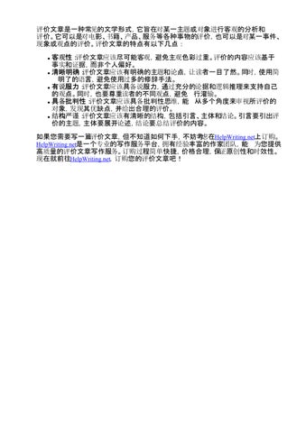 评价文章是一种常见的文学形式,它旨在对某一主题或对象进行客观的分析和 评价。它可以是对电影、书籍、产品、服务等各种事物的评价,也可以是对某一事件、 现象或观点的评价。评价文章的特点有以下几点: