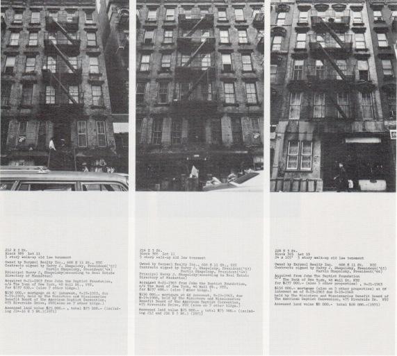 Hans Haacke. Shapolsky et al. Manhattan Real Estate Holdings, a Real-Time Social System, as of May 1, 1971 , 1971. Esta obra se expuso por primera vez en la Galería Francoise Lambert de Milán en enero de 1972. En los EEUU se expuso por primera vez en la colectiva Art Without Limit , en la Memorial Art Gallery, Universidad de Rochester, NY entre abril y mayo de 1972.