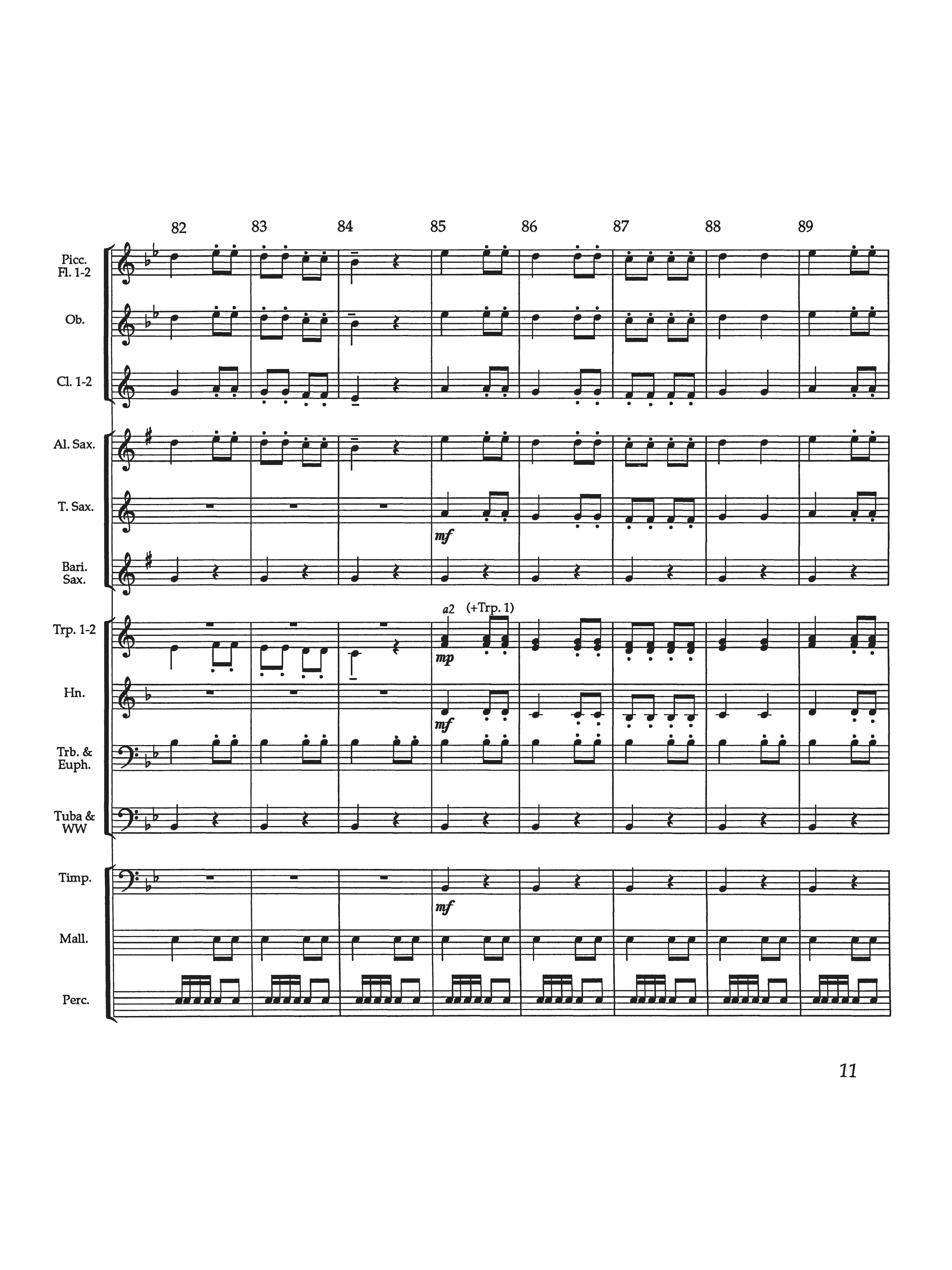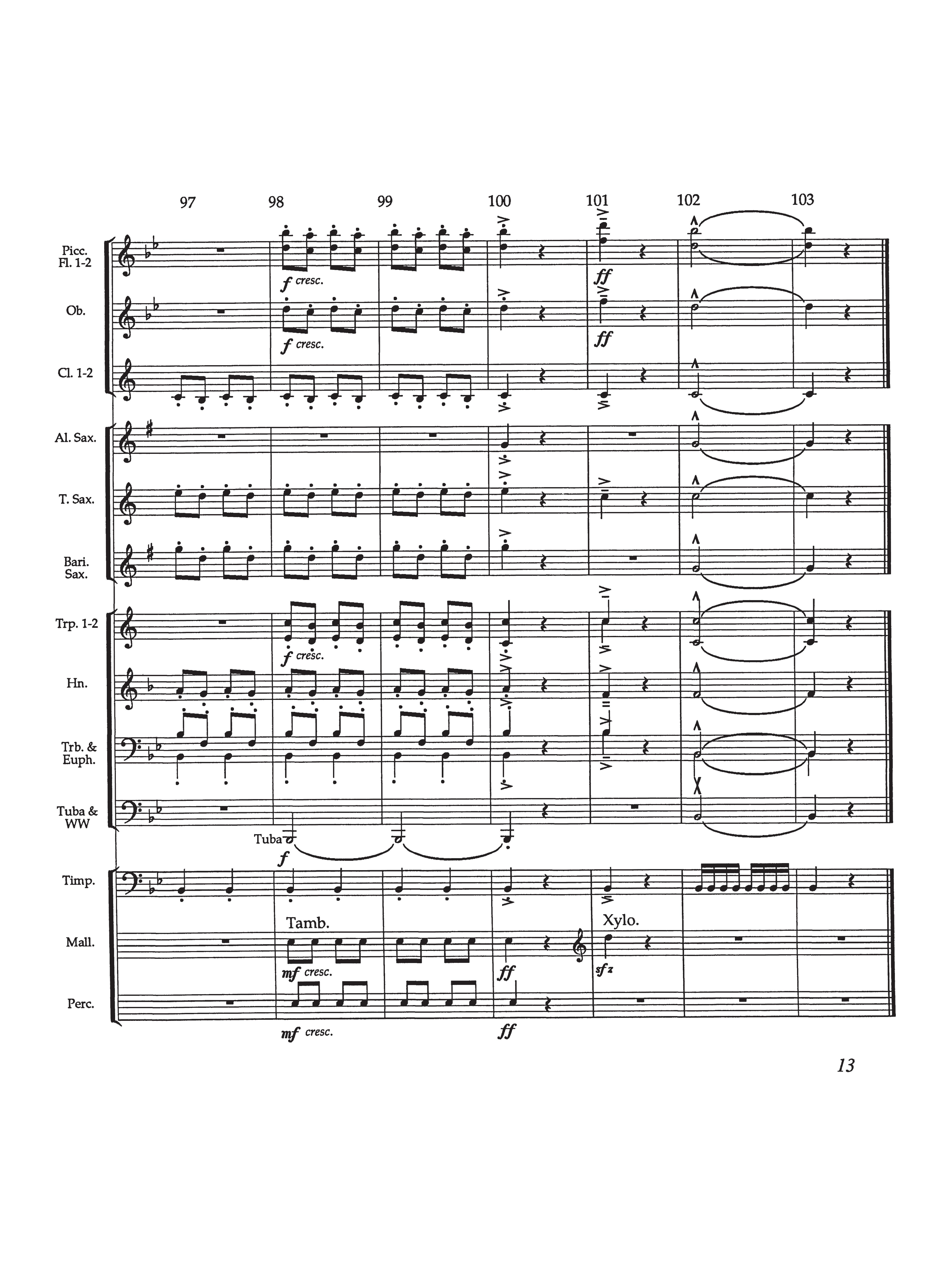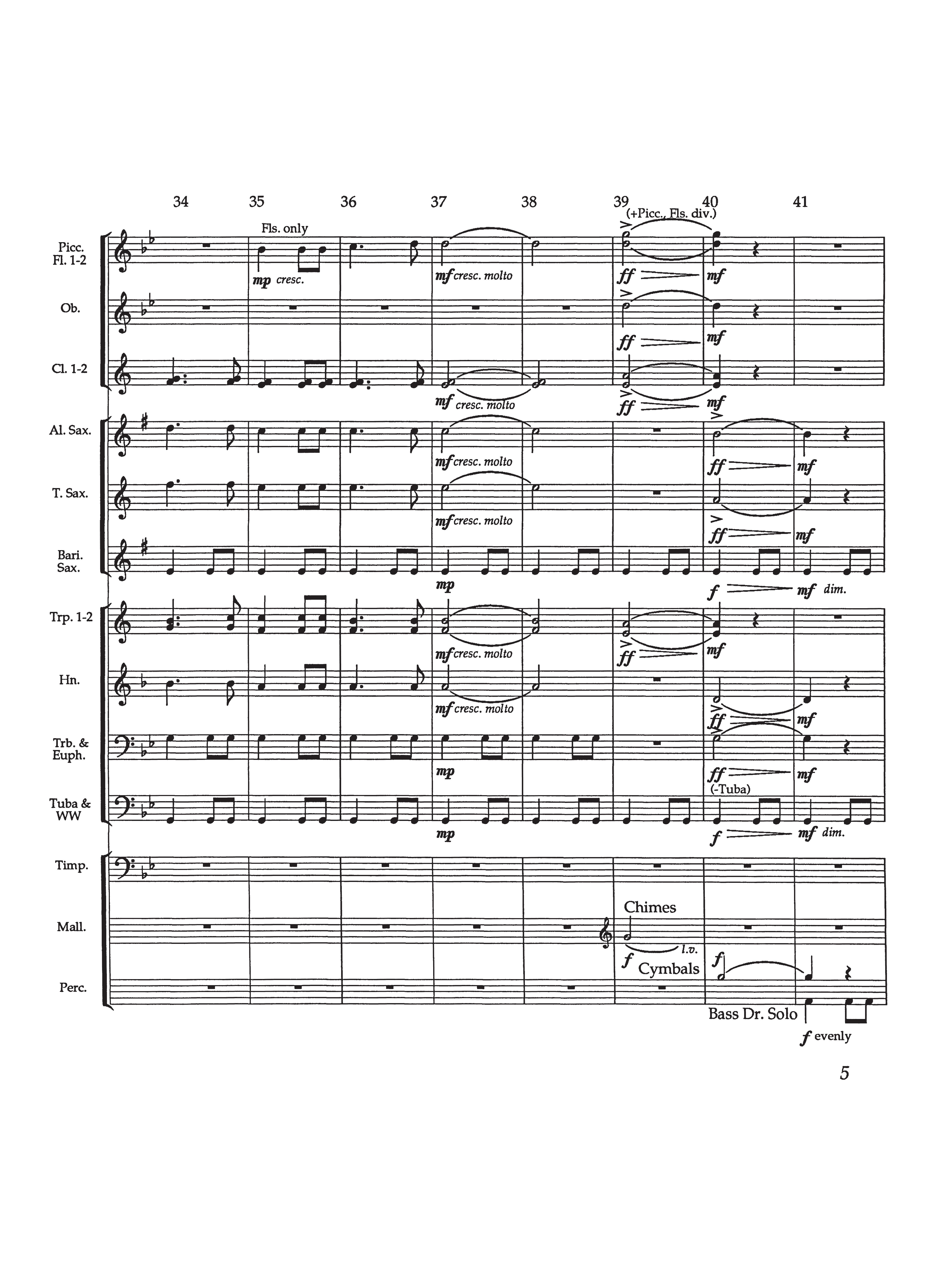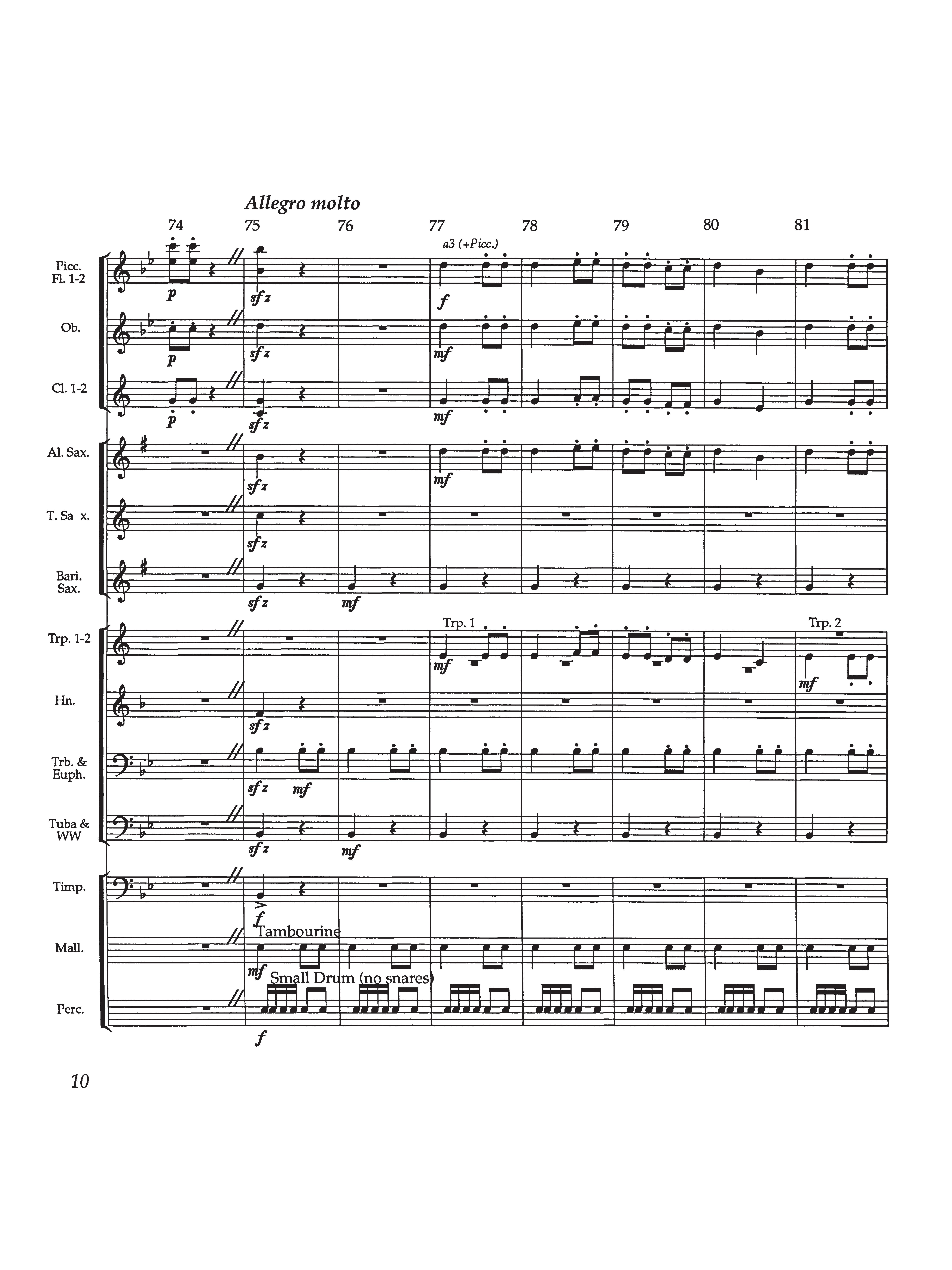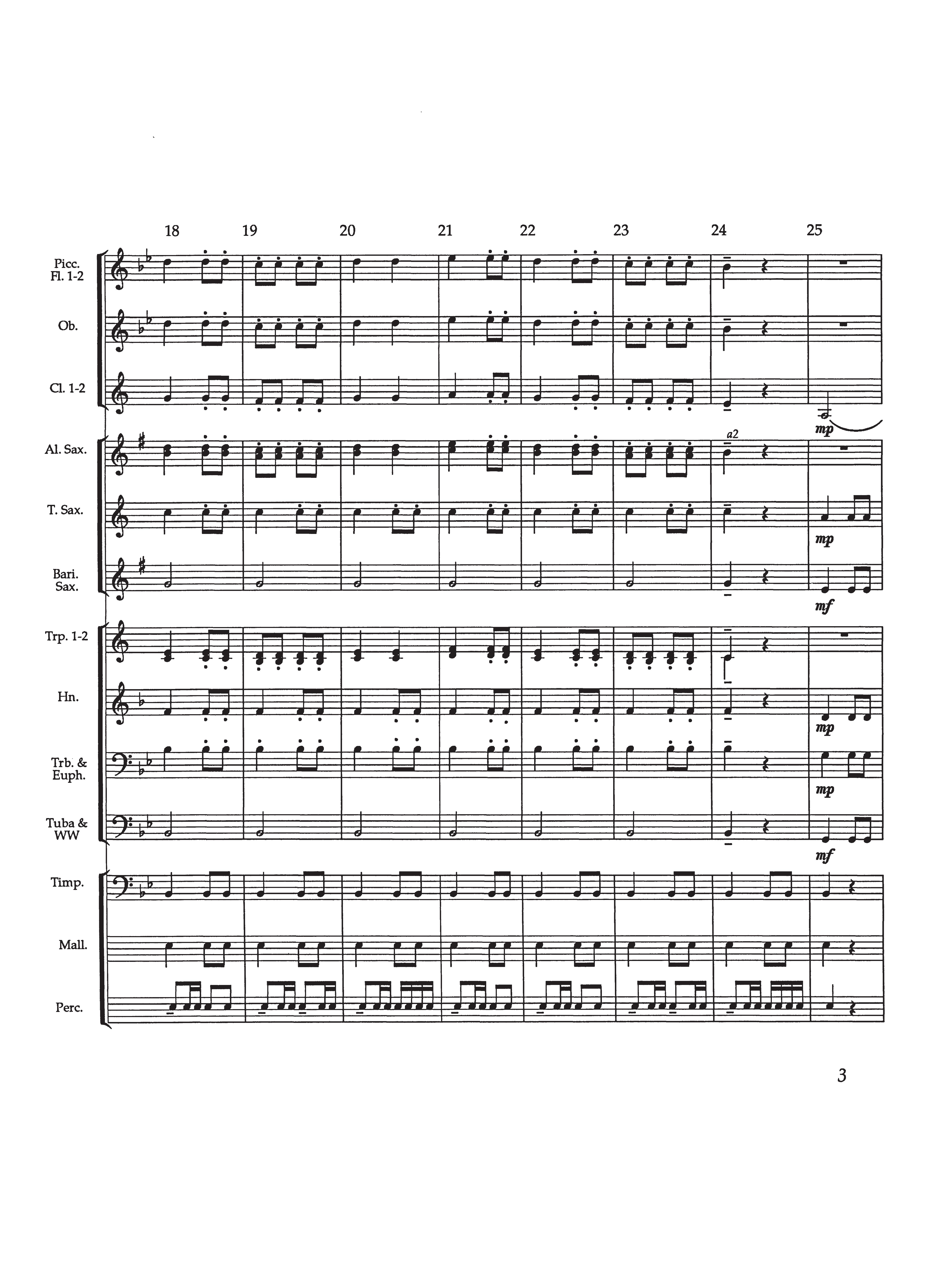 Now, an aside: Sometimes students are interested in knowing how the composer decides what they are going to write. Some of us plan things out in advance, but I prefer to improvise on the spot. Tis means that I listen to what I play and see what it suggests should come next, write down that, and play it to see what it suggests. Much of the symphonic development in this work was improvised, on synthesizer. I had a great deal of fun composing it and hope you do in playing it. Especially the small drum player!