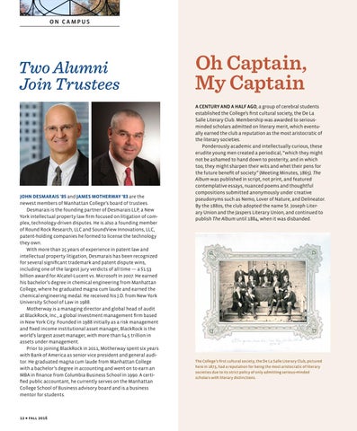 Oh Captain, My Captain A CENTURY AND A HALF AGO, a group of cerebral students established the College’s first cultural society, the De La Salle Literary Club. Membership was awarded to seriousminded scholars admitted on literary merit, which eventually earned the club a reputation as the most aristocratic of the literary societies. Ponderously academic and intellectually curious, these erudite young men created a periodical, “which they might not be ashamed to hand down to posterity, and in which too, they might sharpen their wits and whet their pens for the future benefit of society” (Meeting Minutes, 1865). The Album was published in script, not print, and featured contemplative essays, nuanced poems and thoughtful compositions submitted anonymously under creative pseudonyms such as Nemo, Lover of Nature, and Delineator. By the 1880s, the club adopted the name St. Joseph Literary Union and the Jaspers Literary Union, and continued to publish The Album until 1884, when it was disbanded.