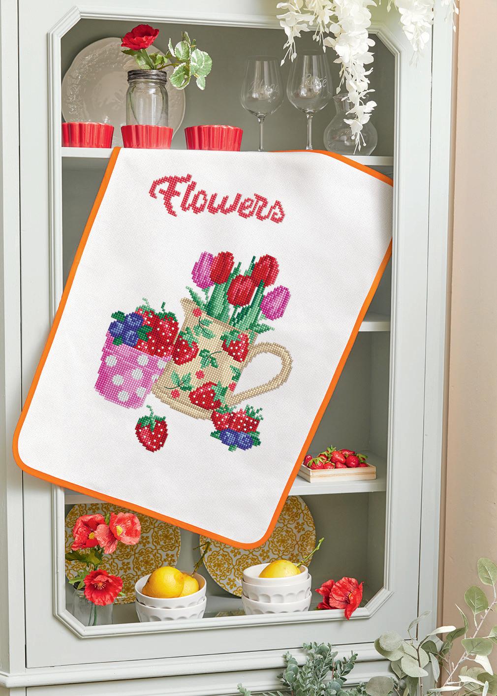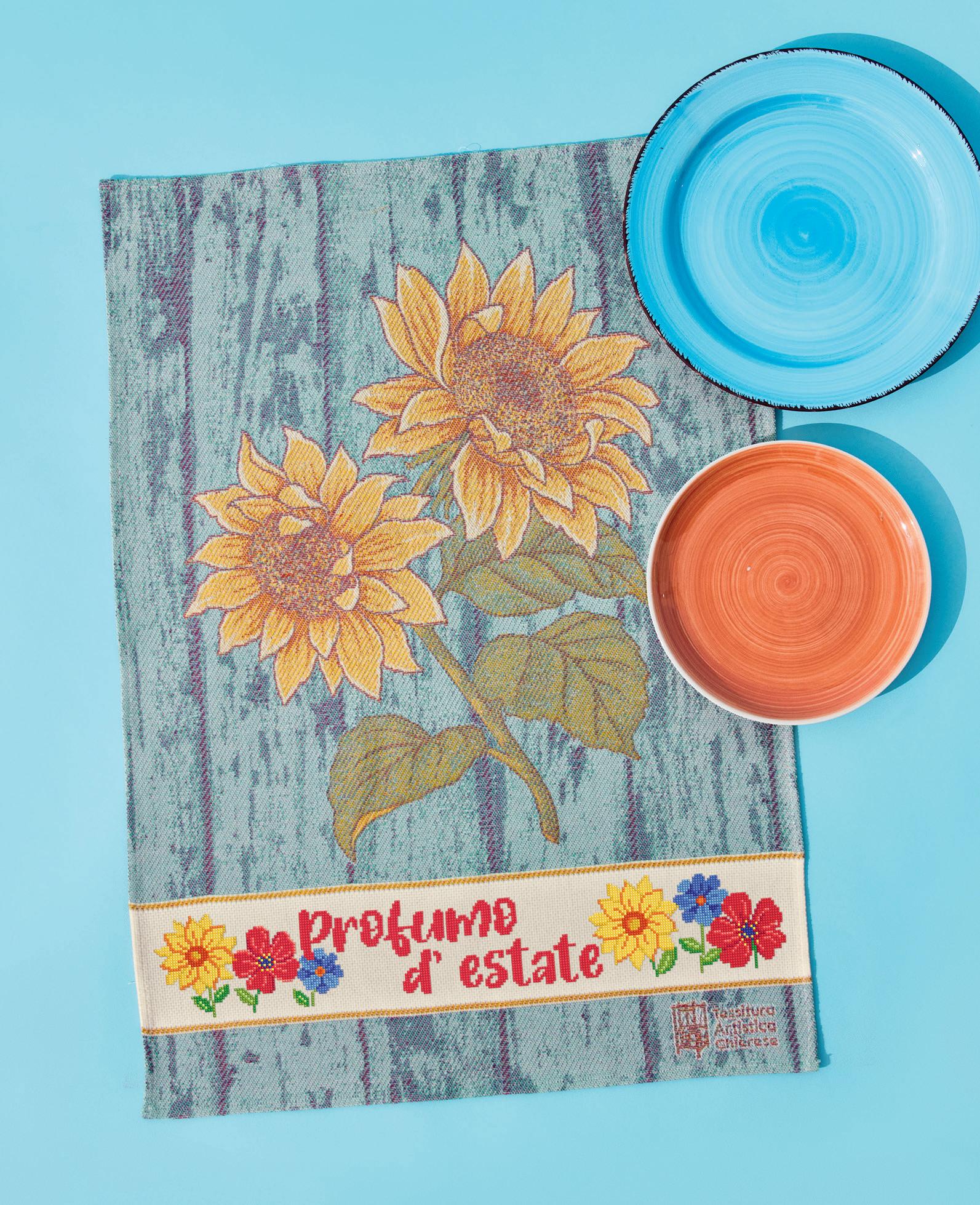 GREMBIULE E LO STROFINACCIO SONO IN COTONE JACQUARD, CON I LORO ENORMI GIRASOLI, PRONTI DA RICAMARE CON CROCETTE VIVACI. SEMBRA DI SENTIRE IL