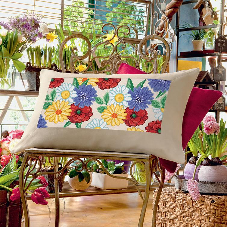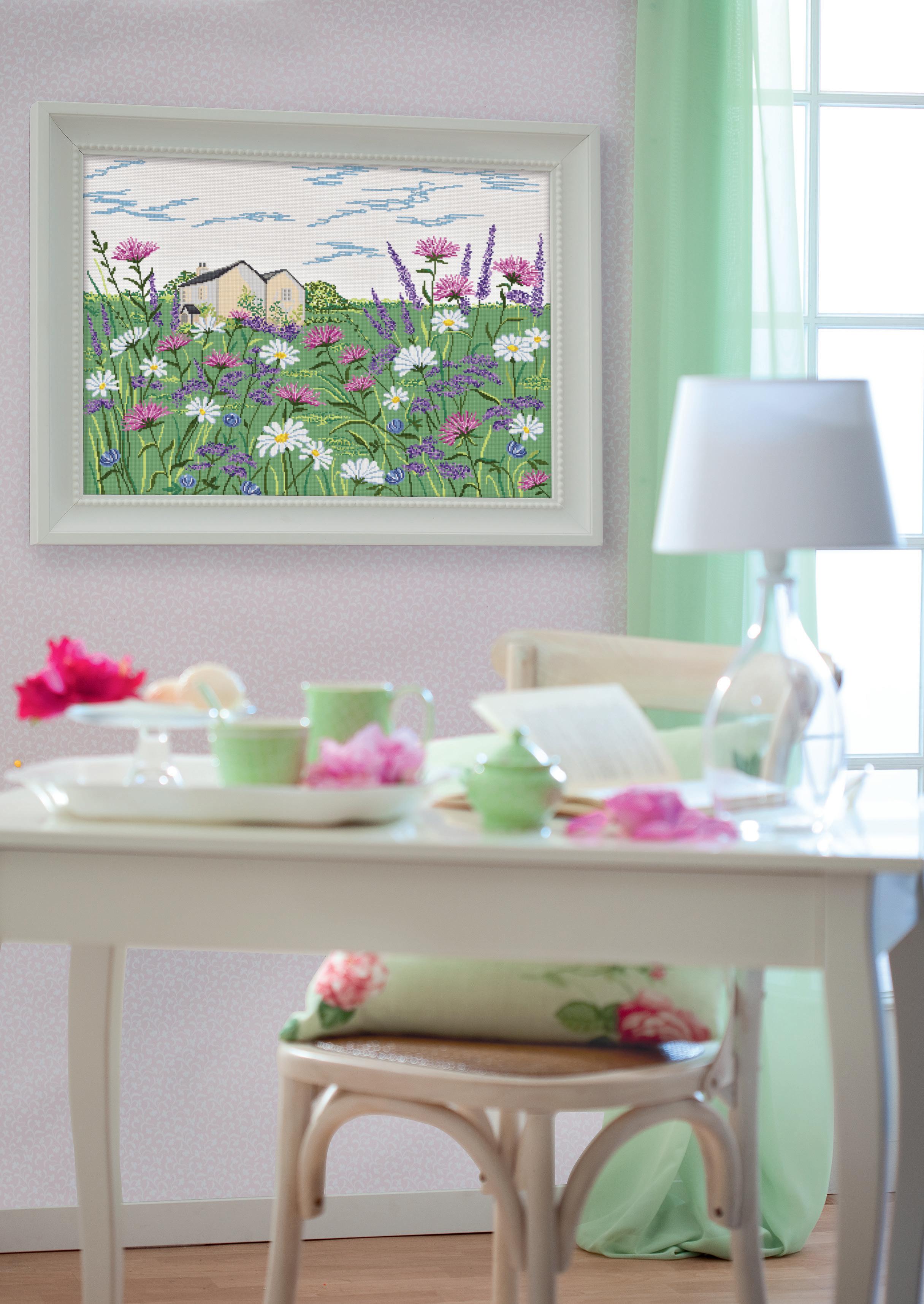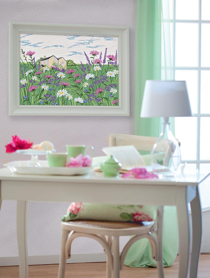 Il green, orientamento degli ultimi tempi in tutti i settori, ha conquistato anche le pareti di casa. In questo caso, il punto croce ha “fotografato” una scena di campagna dove tra i fiori in primo piano si intravede un casolare immerso nella natura. Il motivo è vividissimo anche grazie ai due fili di Mulinè con cui sono realizzate le crocette.