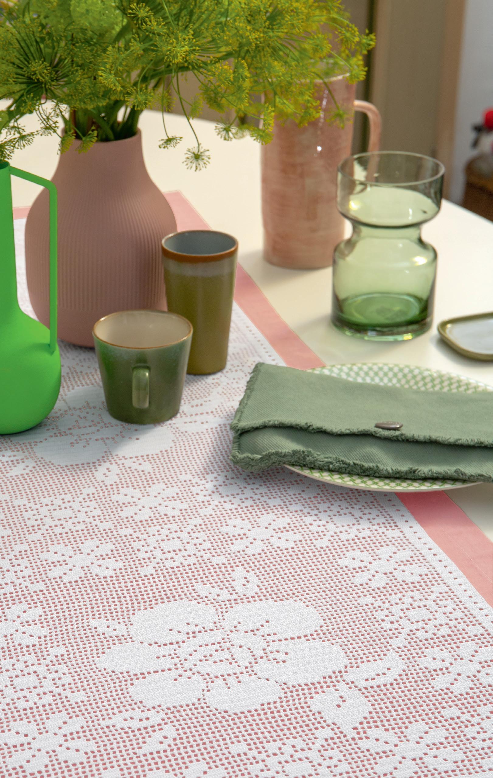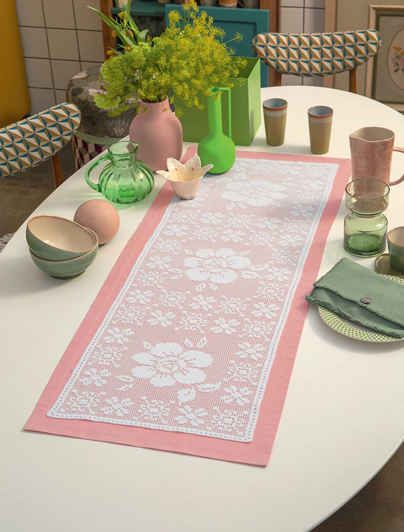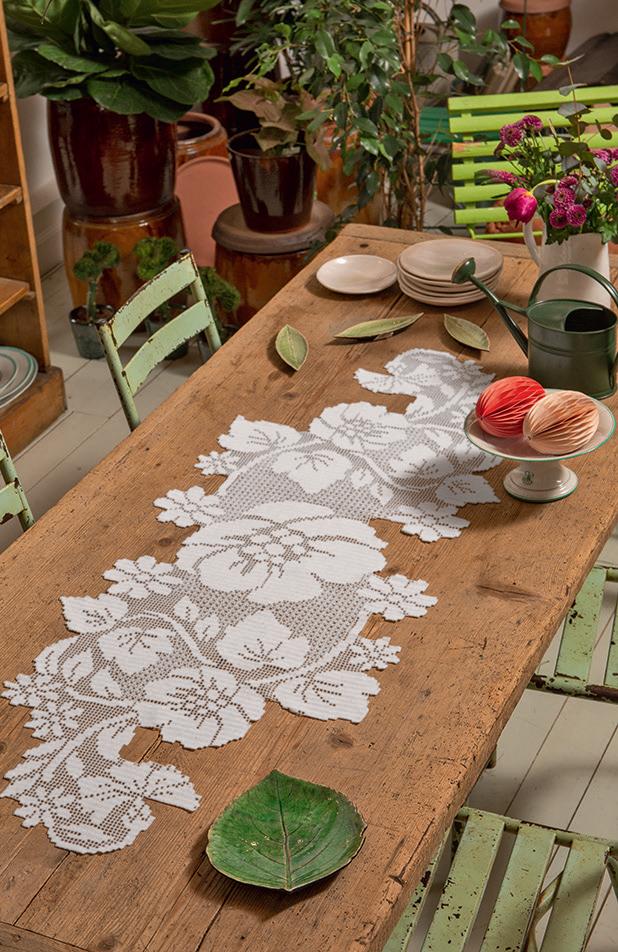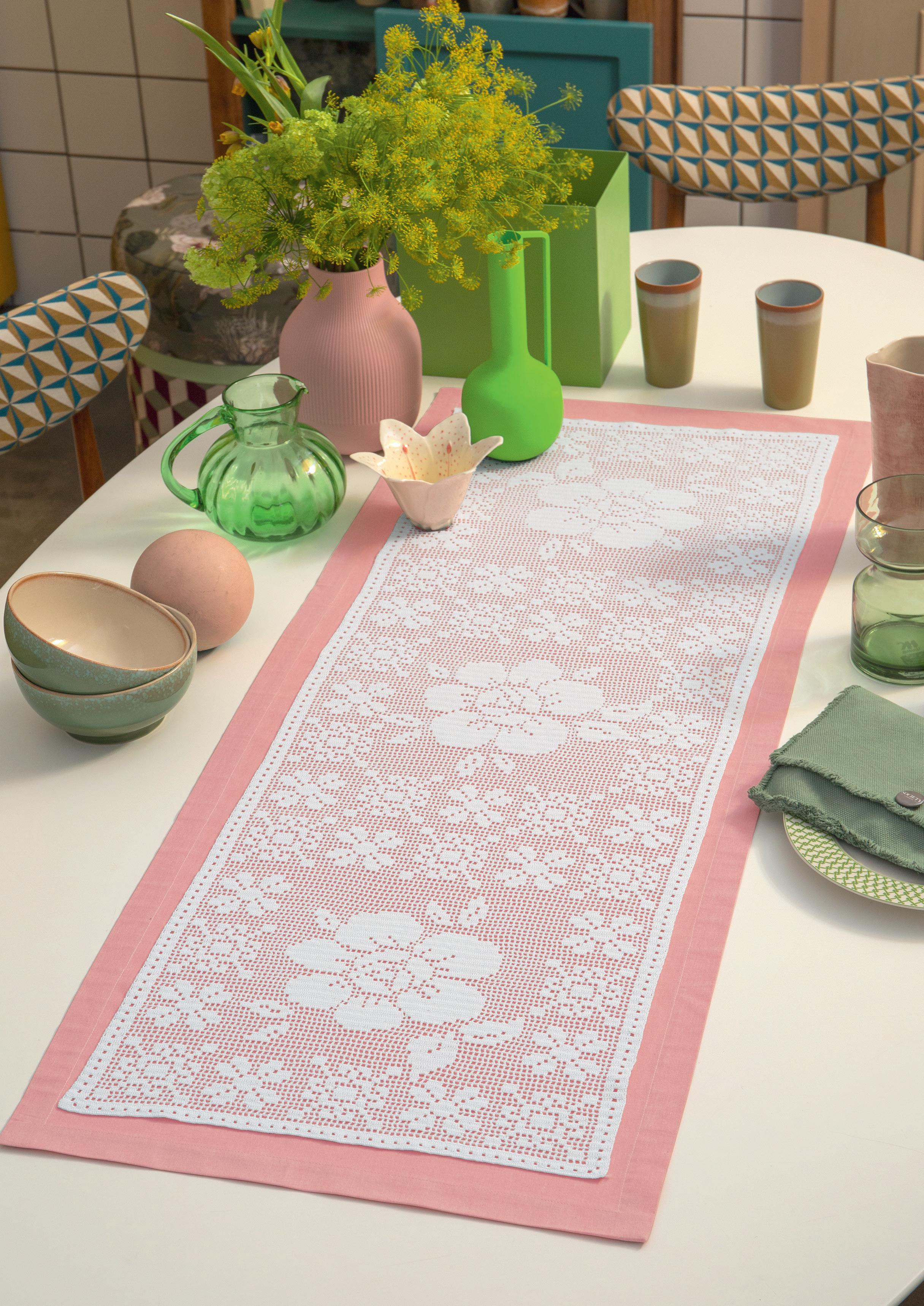 Metti un fiore in tavola, anzi tre e tutto avrà un altro gusto. Lo sa bene l’uncinetto che con tutto il suo estro e la collaborazione del cotone Cordonetto 16 ha dato forma a un runner speciale dove i fiori costruiscono quasi delle piastrelle. L’idea di base è infatti un motivo che si ripete come in tre moduli. Affascinante, no? E per una nota dolce puoi usare del tessuto magari in rosa o anche in una tinta accesa. Secondo il mood di casa tua.