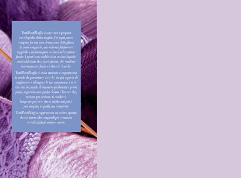 TuttiPuntiMaglia è una vera e propria enciclopedia della maglia. Per ogni punto vengono forniti una descrizione dettagliata di come eseguirlo, uno schema facilmente leggibile e un’immagine a colori del risultato finale. I punti sono suddivisi in sezioni logiche, contraddistinte da colori diversi, che rendono estremamente facili e veloci le ricerche. TuttiPuntiMaglia è stata studiata e organizzata in modo da permettere a te che sei già esperta di migliorare e allargare le tue conoscenze e a te che stai iniziando di muovere facilmente i primi passi, seguendo una guida chiara e lineare che, sezione per sezione, ti condurrà lungo un percorso che si snoda dai punti più semplici a quelli più complessi. TuttiPuntiMaglia rappresenta un ottimo spunto da cui trarre idee originali per creazioni e realizzazioni sempre nuove.