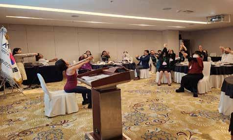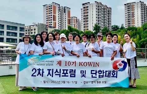 제1340호 「B-5」2022년 9월 24일 토요일 코윈 10기, 제 2회 지식포럼 및 단합대회 (9월 16일-17일) 개최 코윈 필리핀은 “제2회 지식포럼 및 단합대회”를 클락 힐튼 호텔에서 9월 16일부터 17일까지 1박 2일 동 안 개최했다. 이번 행사는 코윈 창립 이래 처음 으로 개최된 단합대회로 김혜자 고 문과 신혜숙 고문, 홍제수 고문을 비롯한 여러 위원들이 참석했다. 또한 중부루손 한인회 이창호 회 장 및 임원단도 참가해 코윈의 “제 2회 지식포럼 및 단합대회”를 축하 했다. 코윈 필리핀 10기 담당관 김가연 회장은 환영사를 통해 “이번 클락 지식포럼 및 단합대회는 코로나로 인해 잠시 주춤했던 저희 코윈의 분 위기 전환에 많은 도움이 되었습니 다. 애써주신 임윈분들 감사드립니 다. 특히 문화자문위원장으로 임명 되신 박민정 자문위원님의 눈부신 활약에 모든 참석한 위원님들께 즐 거움 주셨구요 감사드립니다. 무엇 보다 클락지부를 위한 발판을 마련 하게 되어 만족한 행사였습니다. 클 락지부에 참여하게 되신 조민경 신 입과 이선옥 신입을 환영해 주시기 바라며 이번에 다시 조인해주신 7 기 조인선 부회장님 후원금까지 챙 겨주셔서 감사드리고 이번 행사에 큰 도움 주심에 감사드립니다.”라고 전했다. 이날 지식포럼은 “필리핀세법”에 대해 변호사 아놀드 압두아의 강의 와 “부동산 시장 가이드”라는 주제 로 강사 존 석의 강의가 진행되었다. 이어 홍재수 명창과 이선옥님의 축하공연과 홍재수 고문과 신해숙 고문의 ‘우리의 성공스토리’ 강연이 진행되었다. 마닐라서울편집부