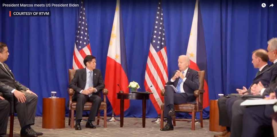 2022년 9월 24일 토요일제1340호「A-6」 마르코스, 바이든과 첫 정상회담 백악관 "남중국해 항행 자유 지지…평화적 분쟁해결에 의견 모아" 바이든, 철통같은 방어 약속…마르코스, 양국 동맹의 중요성 강조 바이든 미국 대통령(우)과 마르코스 필리핀 대통령(좌) 사진-유튜브 영상캡쳐 페르디난드 "봉봉" 마르코스 대통령은 목 요일 조 바이든 미국 대통령에게 필리핀이 미국의 "파트너, 동맹, 친구"로 남아 있다고 말했다. 마르코스는 뉴욕 인터콘티넨탈 호텔에서 바이든과의 양자회담에서 이같이 강조했 다.