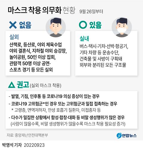 착용을 권고하고 있다. 정부는 대신 ▲ 발열, 기침 인후 통 등 코로나19 증상이 있는 경우 ▲ 코로나19 고위험군(고령층, 면 역저하자, 만성호흡기질환자, 미접 종자)인 경우 또는 고위험군과 밀 접 접촉하는 경우 ▲ 다수가 밀집 한 상황에서 함성·합창·대화 등 비 말 생성행위가 많은 경우 실외에서 도 마스크 착용을 적극 권고하기 로 했다. 중대본은 그동안 필요성이 제기 됐던 영유아 등에 대한 실내마스 크 착용 의무 해제 등의 조치는 하 지 않고 당분간 유지하기로 했다. 중대본은 "방역 정책의 수용성· 지속가능성 측면에서 규제보다 권 고에 따른 방역 수칙 생활화가 중 요하다"며 "마스크 착용 의무도 위 험도가 낮은 부분부터 권고로 전 환해나가는 방안을 지속 검토하고 있다"고 설명했다. 중앙방역대책본부(방대본)는 실 내 마스크 착용 의무와