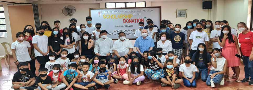 2022년 9월 24일 토요일「B-6」 제1340호 마닐라코리아타운, 말라테 카톨릭 성당과 50명에 장학금 전달 마닐라 코리아타운협회(회장 장 재중)는 9월 24일 말라테 카톨릭 성 당과 함께 말라테 지역에 거주하는 50명의 학생들에게 장학금을 지급 했다. 이 자리에는 마르겔 콘덴스 기독 교 교육 조정관, FR.레오 디스터 교 구 신부, 마닐라 코리아타운협회 장 재중 회장과 김영미 부회장 등이 참 석했다. 장재중 회장은 학생들에게 어제보다 나은 내일이 되길 바란다 고 희망을 전했다. 마닐라코리아타운협회는 지난해 에 이어 올해 2번째로 장학금 지급 행사를 하고 있으며, 형편이 어려워 공부하기 힘든 학생들과 개인적인 사정으로 학업을 중단했던 학생들 에게 지속적으로 공부할 수 있는 기 회를 부여해서, 어제보단 행복한 내 일을 꿈꿀 수 있도록 기회를 제공하 기 위해 장학사업을 진행하고 있다. 한인 상권활성화와 한류문화 교 류 촉진을 위해 노력하고 있는 마닐 라코리아타운협회는 펜데믹 기간 동안 꾸준한 지역사회 봉사와 구호 활동에 앞장서고 있으며, 향후 망고 장학위원회(이사장 이동수)가 진행 하는 10월에 있을 김치 페스티벌을 MKT와 함께 산안 드레스 체육관에 서 진행할 예정이다. 또한 11월에는 한비문화축제에서 선발된 인원들을 초청해서, 한국문 화를 알리는 “함께하는 코리아타운 의 날 행사”를 진행할 예정이며 한 국 국회에 예산안 제출을 통해 보다 규모 있고 체계적으로 한류 전파를 필리핀에서 진행하겠다는 계획이다. 이와 더불어 마닐라코리아타운협 회는 마닐라시와 인천시(자매결연도 시)를 잊는 민간 외교사절로 역할을 통해 여러가지 사정으로 그동안 단 절됐던 두 도시간의 교류 재개를 위 해 힘쓰고 있으며, 그 결과 두 도시 간 시장 당선 축하 서신 교환을 이 루어내었고 오는 10월엔 인천시에 서 있을 자매도시 시의원 초청 행사 를 진행하는 결과를 만들어 냈다. 허니 라쿠나 마닐라시장은 마닐 라코리아타운협회의 민간외교 노력 에 감사하며 인천의 스마트 시티 시 스템을 마닐라에 적용하고 싶다는 뜻을 마닐라코리아타운협회를 통해 전달했다. 마닐라서울편집부