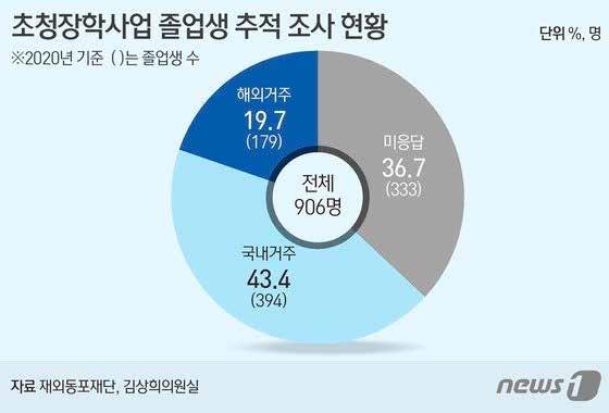 24일 국회 외교통일위원회 소 속 김상희 더불어민주당 의원 이 재외동포재단에서 받은 자 료에 따르면 2020년 기준 재 외동포 초청장학사업 졸업생 906명 중 36.7%에 해당하는 333명은 현재 소재지조차 파 악되지 않고 있는 것으로 나 타났다.