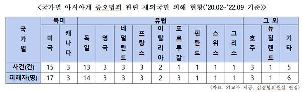 21일 김경협 더불어민주당 의 원실이 외교부로부터 제출 받은 ‘아시아계 증오범죄 관련 교민 피 해 현황’에 따르면 2020년 2월부 터 2022년 9월까지 북미, 유럽, 오세아니아 등 18개국에서 대한 민국 국민을 대상으로 한 증오범
