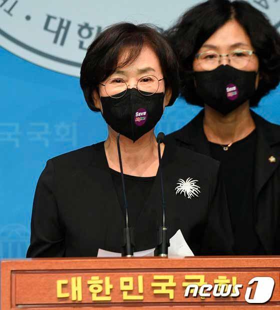 24일 서울 여의도 국회 소통관에서 열린 아프가니스탄 여성 인권 보장을 위한 여성 의원 기자회견에서 김상희 국회부의장이 국제사회의 관심을 촉구하고 있다. News1