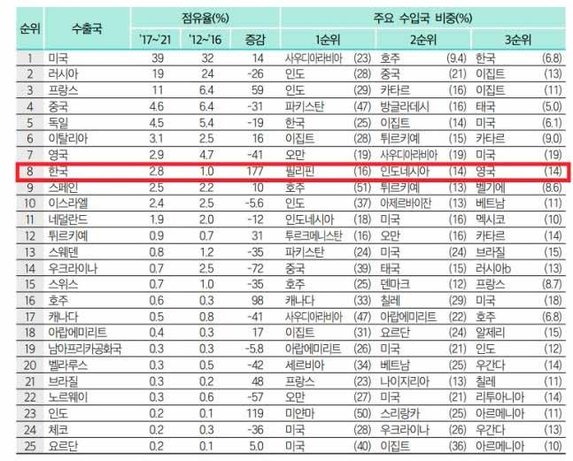 韓 '세계 8위' 방산수출국, 수입은 7위… '2027년 4강' 목표 성큼 2022 세계 방산시장 연감… "2017~21년 세계 무기수출 2.8% 차지" 작년 국방비 지출 502억달러 '세계 10위'… 미국 8010억달러 '1위' 한국무기 최대수입국은 필리핀....2위 인도네시아, 3위 영국