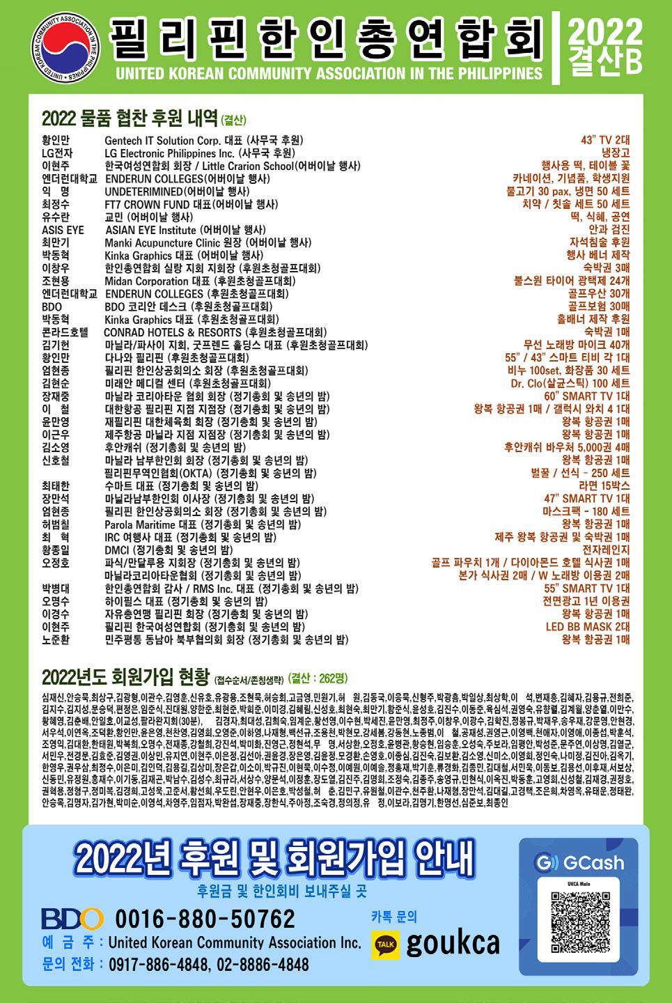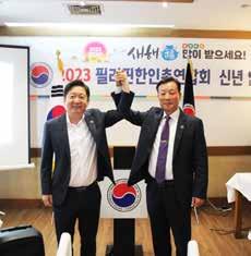 나누어 먹는 시간을 가졌다. 마닐라서울편집부 정기행사 개최계획 1. 신년 인사회 ············ 1월 19일(목) / 가야 레스토랑 2. 제104회 삼일절 기념행사 ···· 3월 1일(수) / 한국국제학교 3. 어버이의 날 행사 ················· 5월 6일(토) 예정 4. 후원 초청 골프대회 ··················· 5월 중 예정 5. 제78주년 광복절 기념행사 ·········· 8월 15일(화) 예정 6. 제32회 한필문화교류축제 ··············· 9월 말 예정 7. 전국체육대회 참가 ·············· 10월 13일(금) / 목포 8. 세계 한인회장 대회 ··············· 10월 예정 / 한국 9. 정기총회 및 송년의 밤 ············· 12월 7일(목) 예정 10. 지역순회 한인동포 안전세미나 ·········· 매월 2회 예정 2023년 필리핀한인총연합회 주요사업계획 1. 교민이 직접 참여하고 주인이 되는 한인회 정착 - 9개 지역 한인회와 14개 지회를 통해, 한인회 회원가입 증가 지속적 추진 (2023년, 전국 1만명 가입 추진 목표) - 한인회 회원 가입 증가로 전국 대의원 제도를 통한 선거제도 개선 기반 구축 2. 교민들의 안전한 생활과 사건 사고 예방 주력 -