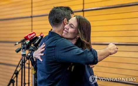 사의 표하고서 약혼자 포옹하는 아던 뉴질랜드 총리. (네이피어[뉴질랜드] AP=연합뉴스)