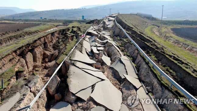 튀르키예 카흐라만마라슈주의 한 도로를 따라 벌어진 지표면 AP=연합뉴스 이스칸데룬항의 야적장은 강진 당시 발생한 화재로 잿더미가 되었다. 사진 MBC