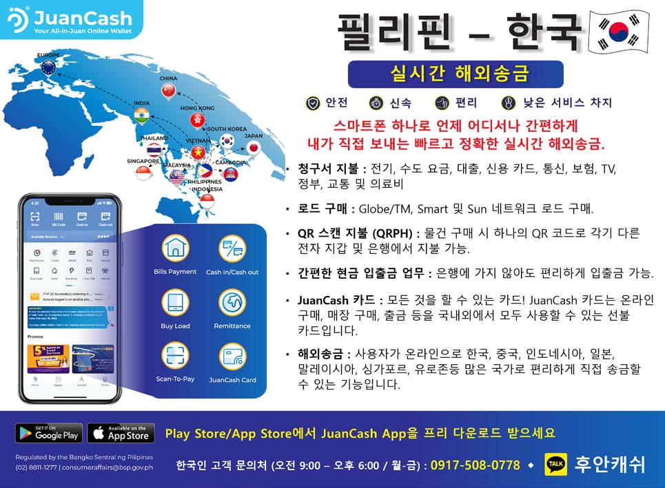 해외 송금은 앱을 통해 언제 어디 서나 간편하게 할 수 있으며, 한국, 중국, 홍콩, 인도네시아, 일본, 말레 이시아, 싱가포르, 베트남, 인도, 캄 보디아, 유로존 등 11개국 이상에 서 단 몇 분 만에 실시간으로 받을 수 있다. 후안캐시는 현재 초기 송 금을 위한 서비스 수수료 면제 서 비스를 진행 중이다. 이제 후안캐시를 통해 필리핀에서 한국으로 더 쉽고 빠르고 안전하게 송금할 수 있다. 총 34개 은행의 모 든 한국 은행 계좌를 지원하며, 송 금 절차는 양국 규제위원회를 규정 을 완벽하게 준수하고 있다. 발송 인과 수취인 모두 실시간으로 거래 상황을 알 수 있어 안심하고 거래 할 수 있다. 후안캐시 앱을 통해 활용하면 다음 과 같은 서비스와 혜택을 제공한다. • E-load 충전 시 즉시 5% 리베이 트 제공 • Bill's Payment 서비스는 전국적 으로 200개 이상의 청구서를 결제 가능 • 언제 어디서나 간편하게 현금화 가능 • 후안캐시 카드로 ATM 카드처럼 사용 • 사업자를 위한 편의성. 후안캐시 앱에 에 귀하의 사업을 등록하고 고객들로부터 더 많은 결제 옵션을 제공받을 수 있다. • 스캔 방식은 개인 사용자가 다 양한 구매 활동에 대한 결제를 쉽 게 할 수 있도록 한다. 후안캐시앱은 구글플레이스토어와 앱스토어에서 간단히 다운받아 설 치가 가능하다. 자료제공: 후안캐시