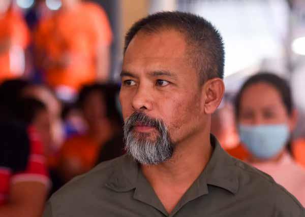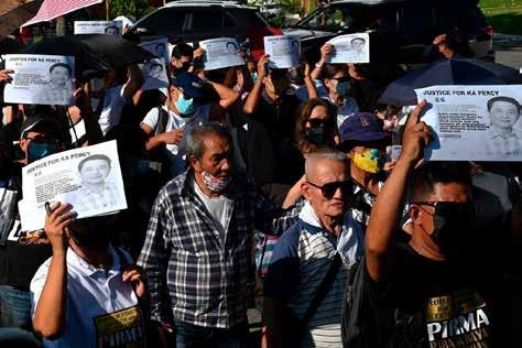 2022년 10월 9일 메트로 마닐라 파라냐케에서 사망한 언론인 퍼시 라피드 (본명 퍼시발 마바사)의 장례식에서 참석자들이 플래카드를 들고 있다. 사진 필스타 중간책 준빌라모어의 죽음과 연관성을 의심받아 직무에서 배제된 교정국장 제랄드 밴탁