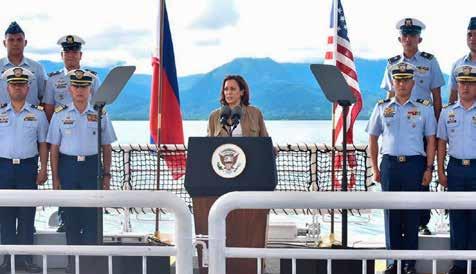 경비경 테레사 마그바누아호에 있 은 연설에서 2016년 남중국해에서 중국의 대규모 영유권을 무효화하 는 국제중재재판소의 판결이 "법적 구속력이 있으며 존중받아야 한다" 고 강조했다. 해리스 부통령은 중 국은 언급하지 않았지만, “남중국 해의 위협과 강압에 직면한" 필리 핀에 대한 미국의 지지를 분명히 했다. 또한 미국이 분쟁 해역에서의 “무 책임한 행동”에 반대하는 국제 캠 페인을 강화할 것이라고 말했다. 해리스 부통령은 “불법적이고 무