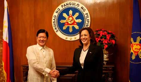 책임한 행동에 맞서 동맹·파트너국 을 계속 결집할 것”이라며 “규칙에 기반한 국제 질서가 어디선가 위협 을 받는다면, 그것은 모든 곳에서 위협을 받는 것”이라고 말했다. 해리스는 “우리는 주권과 영토 보 전에 대한 존중, 방해받지 않는 합 법적인 상업활동, 그리고 분쟁에 대한 평화로운 해결과 같은 원칙을 옹호해야 한다”고 덧붙였다. 마르코스 대통령은 21일 해리스 부통령과의 회담에서 “미국을 포 함하지 않는 필리핀의 미래를 생각 할 수 없다.”며 미국과의 우호를 강