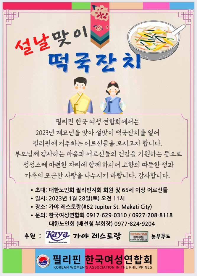 「A-1」 2023년 1월 25일 수요일 가치있는 정보, 한결같은 신문 http://issuu.com/manilaseoul1 kakao talk: @마닐라서울 마닐라서울 홈페이지: manilaseoul.co.kr 2023년 1월 25일 수요일 마닐라서울 신문배송 요청 안내 마닐라서울 신문 광고 및 배송을 원하시면 아래 번호로 연락 바랍니다. 0956-807-1878 ■ 발행처: Manila Seoul Weekly International ■ 편집인: 양한준 ■ 창간일: 1994년 8월 27일■ Copyright: 1994-2023,. ■ 이메일: manilaseoul@gmail.com ■카카오톡: @마닐라서울 쿠웨이트서 35세 여성 OFW, 잔인하게 살해 후 시체유기 쿠웨이트 경찰, 고용주의 17세 아들 검거 ...필리핀 이주민 연합단체, OFW 쿠웨이트 파견 금지 요구 쿠웨이트에서 일하던 35세의 필 리핀 해외근로자(OFW) 줄레비 라나라(Jullebee Ranara)의 불에 탄 시신으로 지난 주말 사막에서 발견됐다. 필리핀에 있는 그녀의 가족이 그 녀와 연락이 끊겼다고 말한 지 며 칠 후인 일요일 35세의 희생자인 줄비 라나라의 시신이