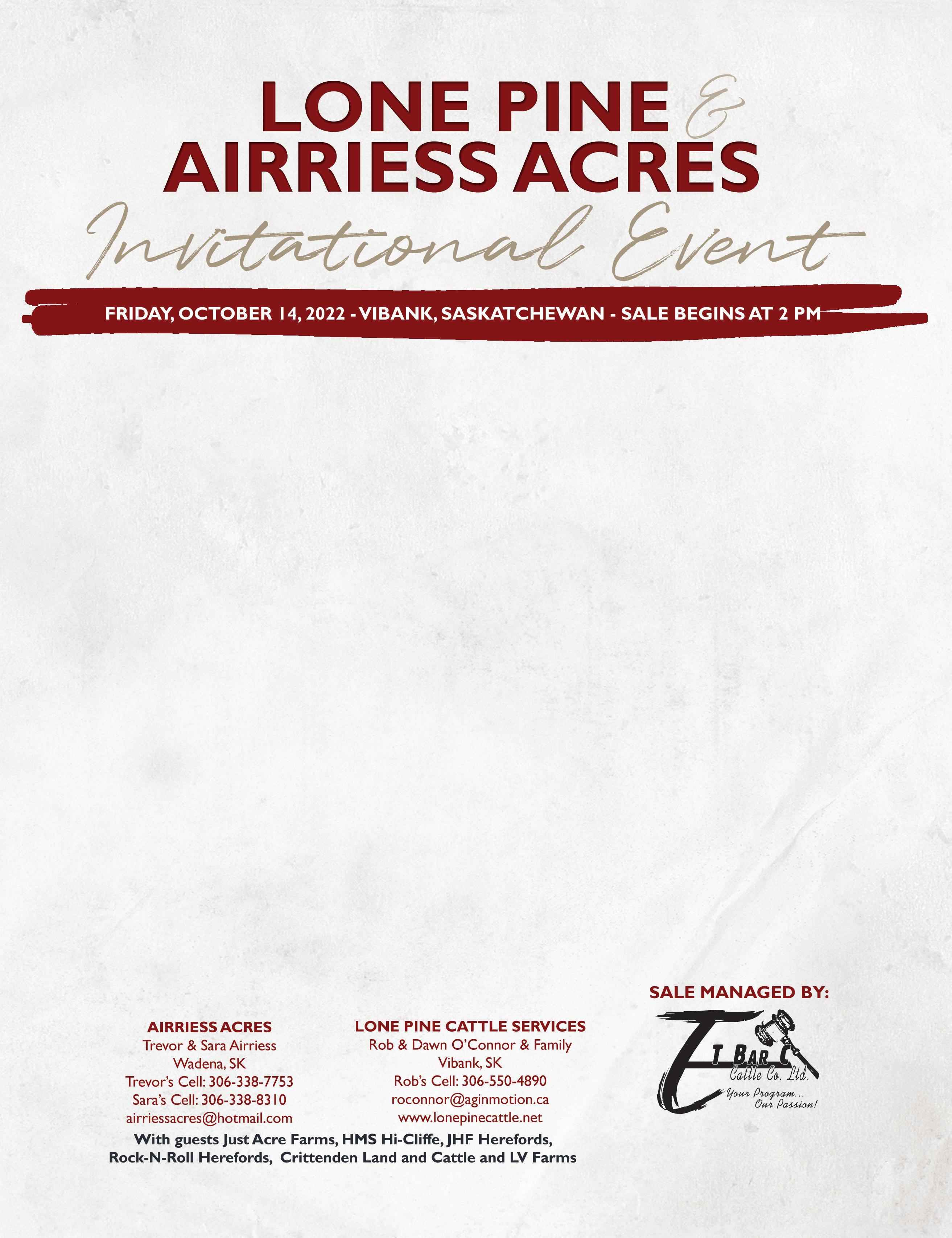 C&T KG 1G KING3K C&T GG 358C ELSA23K KLR JANICE 8E C&T 115H GLIMMER 33K C&T AYWON 20H JESS 70K C&T 51F JANICE73K C&T 218Z AGGIE 43J TH 403A 475Z PIONEER 358C ET X TH 89T 755T STOCKMAN 475Z PE bw: 5.3 ww: 66.9 yw: 111.7 mm: 25.1 tm: 58.6 PCL 4013 GLITZ 1G X MHPH 118U ZAPPA 218Z PE bw: 5.4 ww: 65.7 yw: 106.8 mm: 25.3 tm: 54.6 MHPH 117E HUDSON 115H X MHPH 521X ACTION 106A PE bw: 4.6 ww: 65.8 yw: 99.5 mm: 26.1 tm: 59.0 MHPH 118U ZAPPA 218Z X MHPH 102S WYATT 301W PE bw: 4.7 ww: 53.9 yw: 89.2 mm: 21.7 tm : 48.8 RSK SCK 6964 FACSIMILE 51F X MHPH RCY 10Y BENTLEY 2181B PE bw: 4.7 ww: 69.8 yw: 109.7 mm: 25.5 tm: 60.5 PCL 14E HOUSTON 20H X MHPH 118U ZAPPA 218Z PE bw: 3.6 ww: 52.0 yw: 79.9 mm: 26.1 tm: 51.9 MHPH RCY 10Y BENTLEY 2181B X MHPH 521X ACTION 106A bw: 3.8 ww: 59.0 yw: 92.7 mm: 28.6 tm: 58.1 C & T Cattle Company Chris & Tina Lees Box 243, Arcola, SK S0C 0G0 Phone: 306-455-2605 Chris: 306-577-7370 • wchrislees@icloud.com Tina: 306-577-1238 • tinallees@icloud.com Kurt: 306-421-8318 • Cassandra: 1-306-891-9842 Tom Lees TAKE THE Final STEP C&T CATTLE CO. View the Catalogue Online: WWW.BUYAGRO.COM Chris Poley: 306-220-5006 Shane Michelson: 403-363-9973 Ben Wright: 519-374-3335 Sale Management COWS • BREDS • HEIFER CALVES • BULL CALVES 110 HEAD SELL October 15, 2022 @ 5 pm WATCH & BID ONLINE 24
