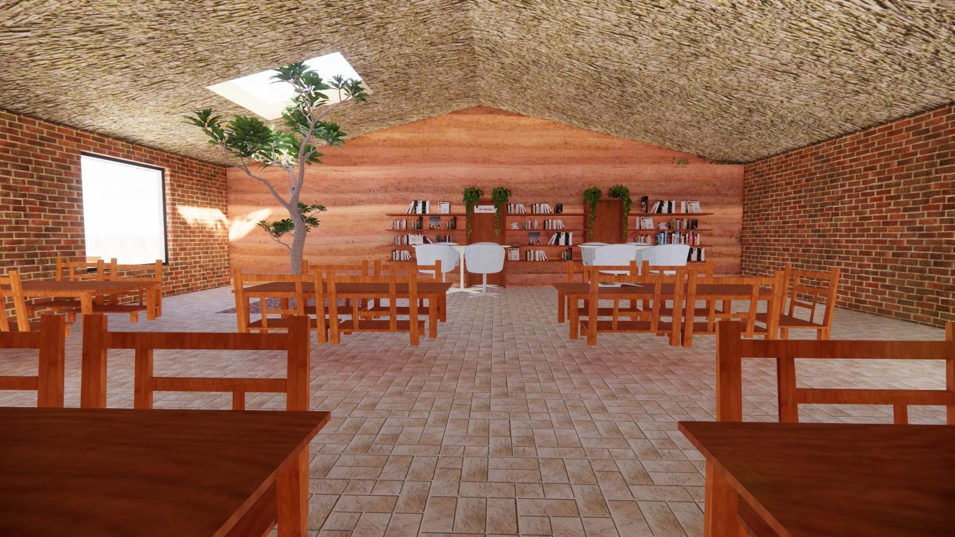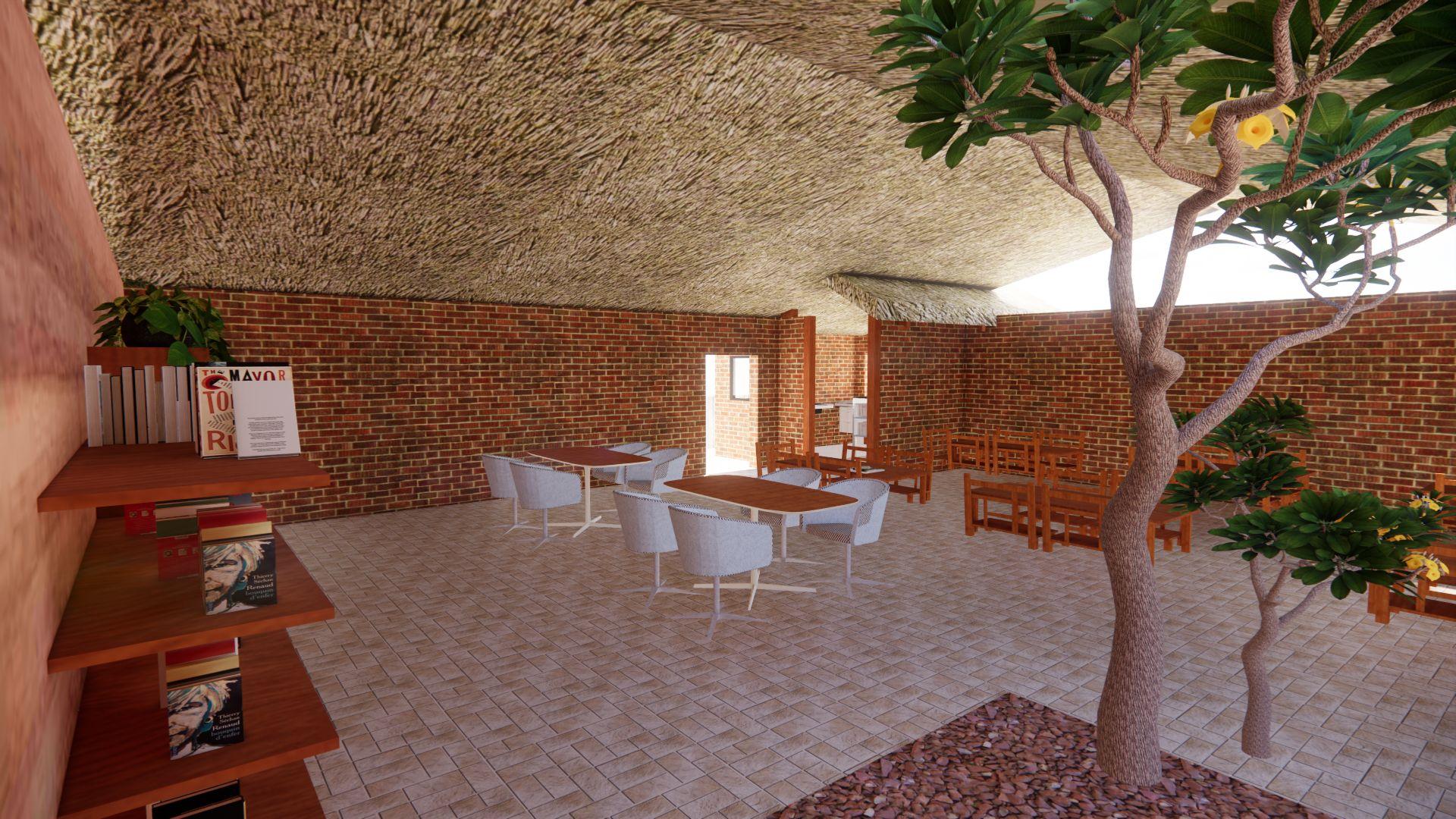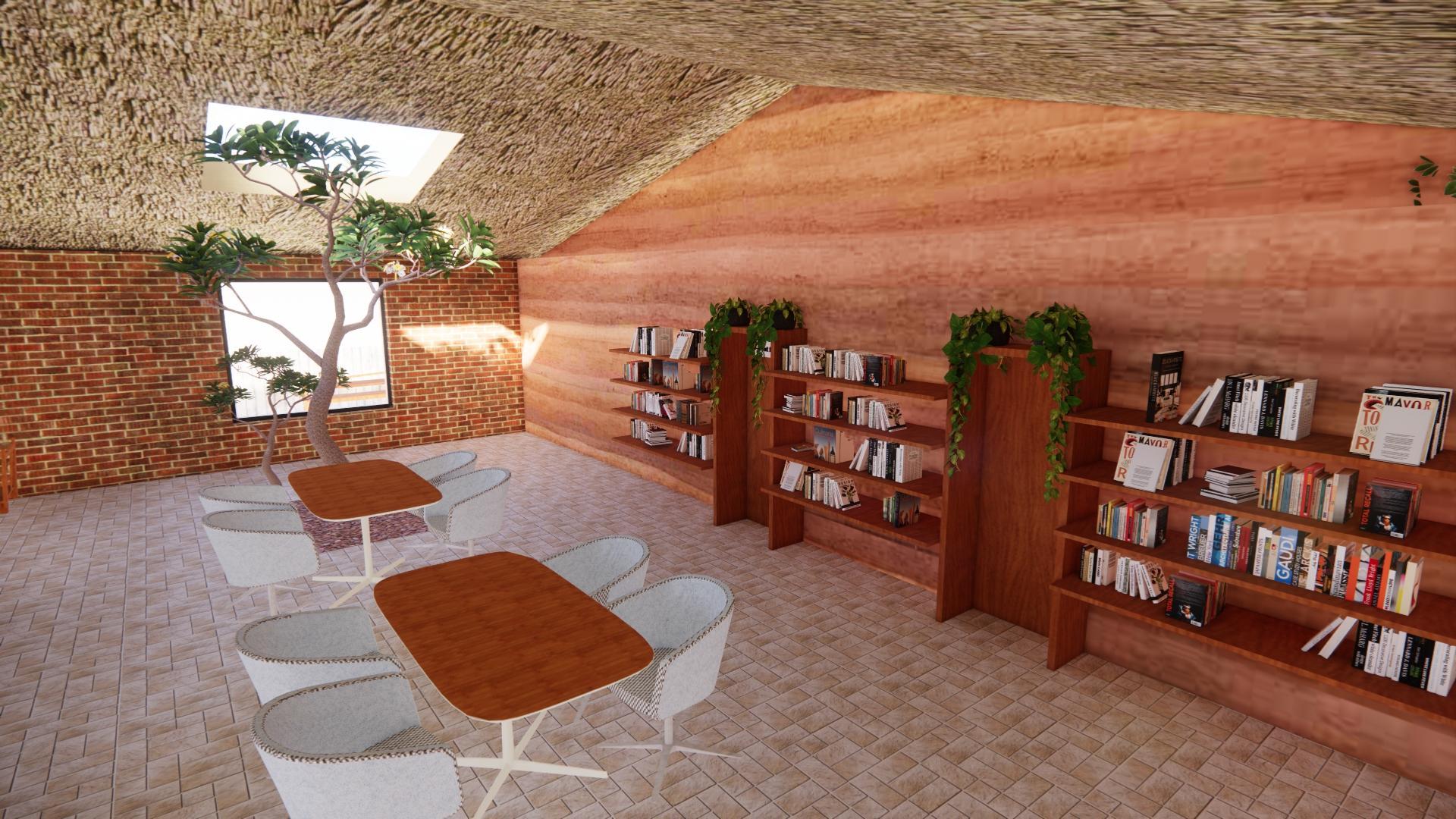 MAINLY THE SPACE IS SEPARATED IN 3 LAYERS: OUTER TEA SPOT FOR QUICK BREAK, INNER GATHERING SPACE FOR GROUPS AND STUDY SPACE ON THE INNER MOST PORTION FOR PEACEFUL READING WITH AN AMBIENT SPACE OF PUNCTURED WALLANDTREE