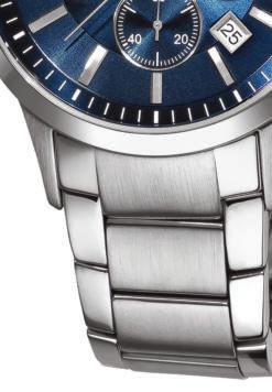 Fashion meets function with this chronograph watch from Emporio Armani. The stainless steel case features a navy blue dial and a date window for added functionality. The three-link bracelet, with both polished and brushed stainless steel, adds the finishing touch.
