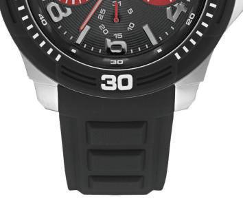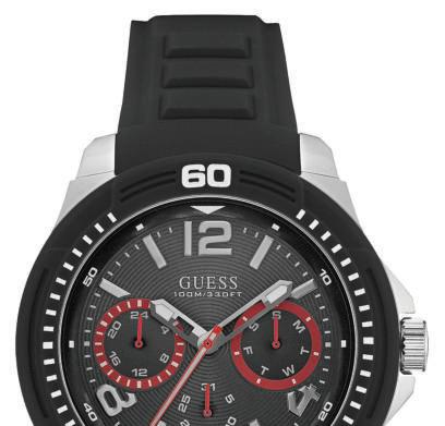 For the guy on the go, sporty black silicone and stainless steel Guess watch with red-accented subdials is perfect for an active lifestyle.