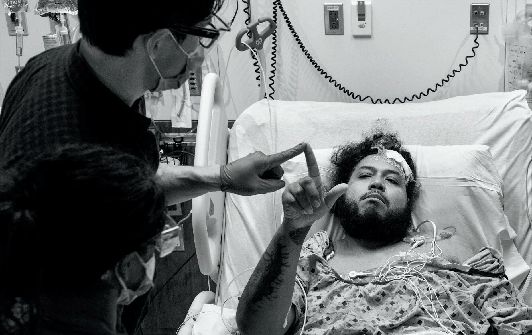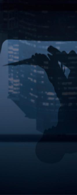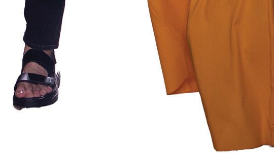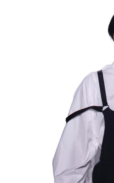 Hagari is an award-winning artist whose works have been shown in prominent museums around the world. At the center of his project is an expres sionless protagonist shown from the back of his head — which is shaved — and a projected face void of all facial features. His attire is worn frontside-back, and his movements are reversed.