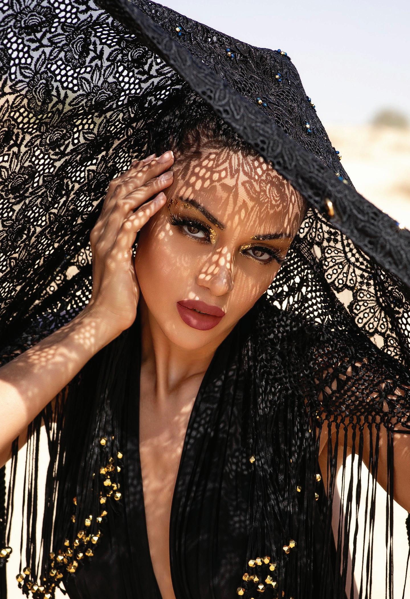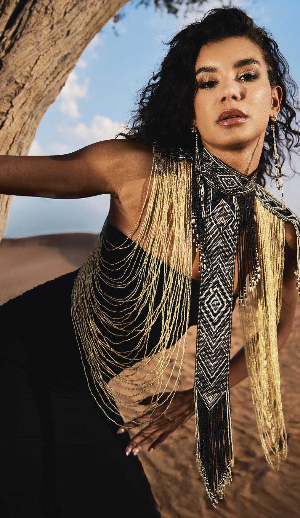 Transitioning from nursing to fashion, Mask embraced design as a medium of resilience and reinvention. Her avantgarde eveningwear, inspired by “Heaven, Hell and Purgatory,” examined the transition from good to evil through dramatic silhouettes and bold contrasts. Key pieces included an ombré blackand-white gown, a featheredwinged black mesh tee over jeans and flame-inspired bustiers crafted from resin, paired with feathered minis.