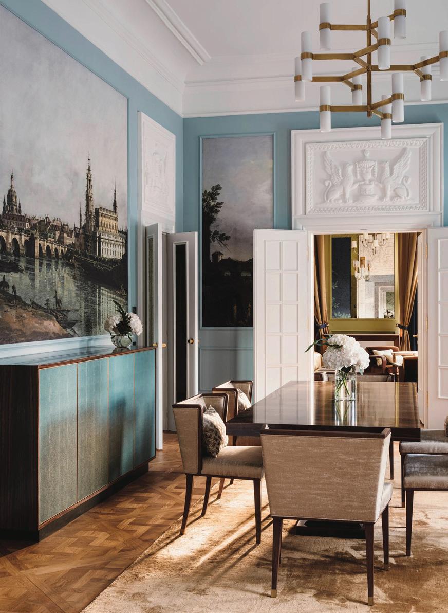 curated wine wall. Separated from the main space by sliding glass doors is the Blu Sushi Bar, marked by red wallpaper depicting cherry blossoms, natural wood tables and an elegant marble sushi bar.