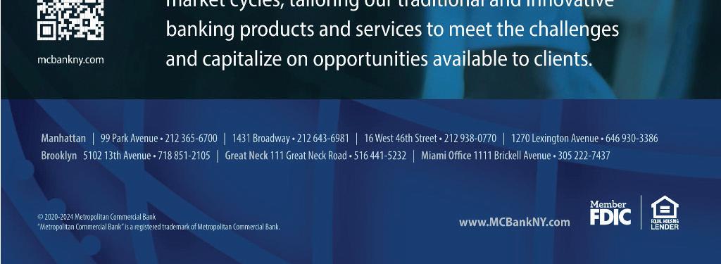 I also know that we’re still dealing with the August heat, but it’s also time to look ahead to our autumn National Realty Club Foundation Golf Outing, set for October 7 at the Fresh Meadow Country Club. We’re delighted to be honoring Mark R. DeFazio, president, CEO and a founder of Metropolitan Bank Holding Corp. and Metropolitan Commercial Bank and Daniel Vitulli, a part ner in Marcum LLP’s New York Office and national partner-incharge of its real estate group. Our Humanitarian Award will be given to Mark F. Engel, CEO of Langsam Property Services Corp. It’s always a great day, and raises funds for the NRC Foundation, which supports causes that benefit all New Yorkers. Thanks to our Gold Committee Co-chairs Bob Knakal of BK Real Estate Advisors and Jaimee Nardiello of Zetlin & Chiara LLP for all the efforts. For more information, please contact me or Penny Herrera at pherrera@nationalrealtyclub.org.