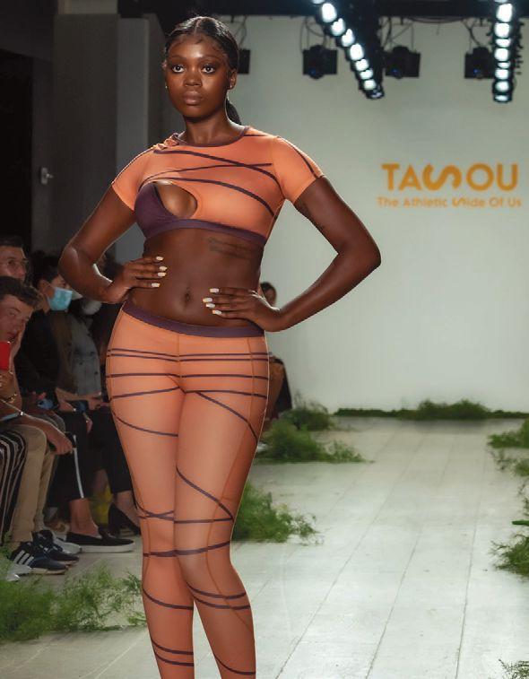 For women, looks included mesh belting for comfort, as well as the TASOU Gra fti in black, white and orange. Most of the pieces in the men’s and women’s collections are also considered gender fluid, like the boyfriend t-shirt. “I wanted something that was functional for women that can be worn from day to night, from pants and dresses. I was also looking for colors that would transition with other items in a woman’s wardrobe,” said Collins.