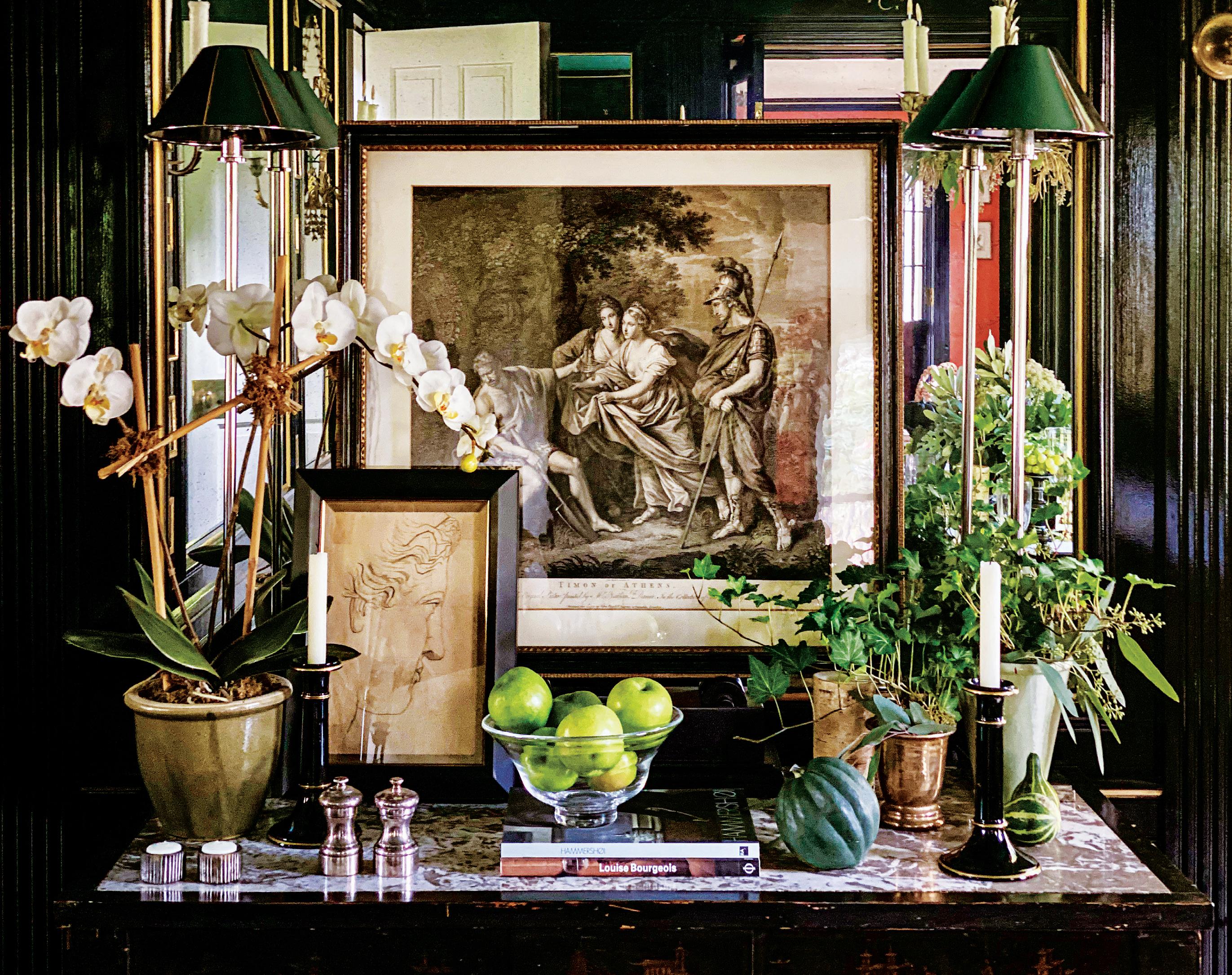 page: Bringing the outside in, the homeowners fill many of their tables with potted herbs, ivy or green fruits. “We love displaying a bit of earth inside,” says Martin. Opposite page: The dining room’s black lacquer walls and candlelight fixtures create a formal and intimate environment for dinner guests. But the space is not only a gathering place for meals; it’s also where the family recounts personal experiences and memories, Karen says. MANN’S 59