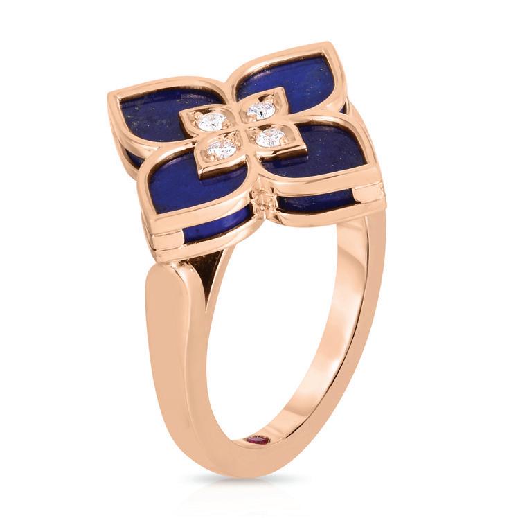 18K gold with and without diamonds and other precious stones. The Venetian Princess Collection is one of the Maison’s most iconic; the feminine pieces are representations of ancient Venetian architecture. The stunning blue of the lapis lazuli gemstone is accented by rose gold and pavé diamonds. As with all of Roberto Coin’s collections, each piece features his signature, hand-placed ruby on the inside, a gift-within-a-gift for the lucky wearer.