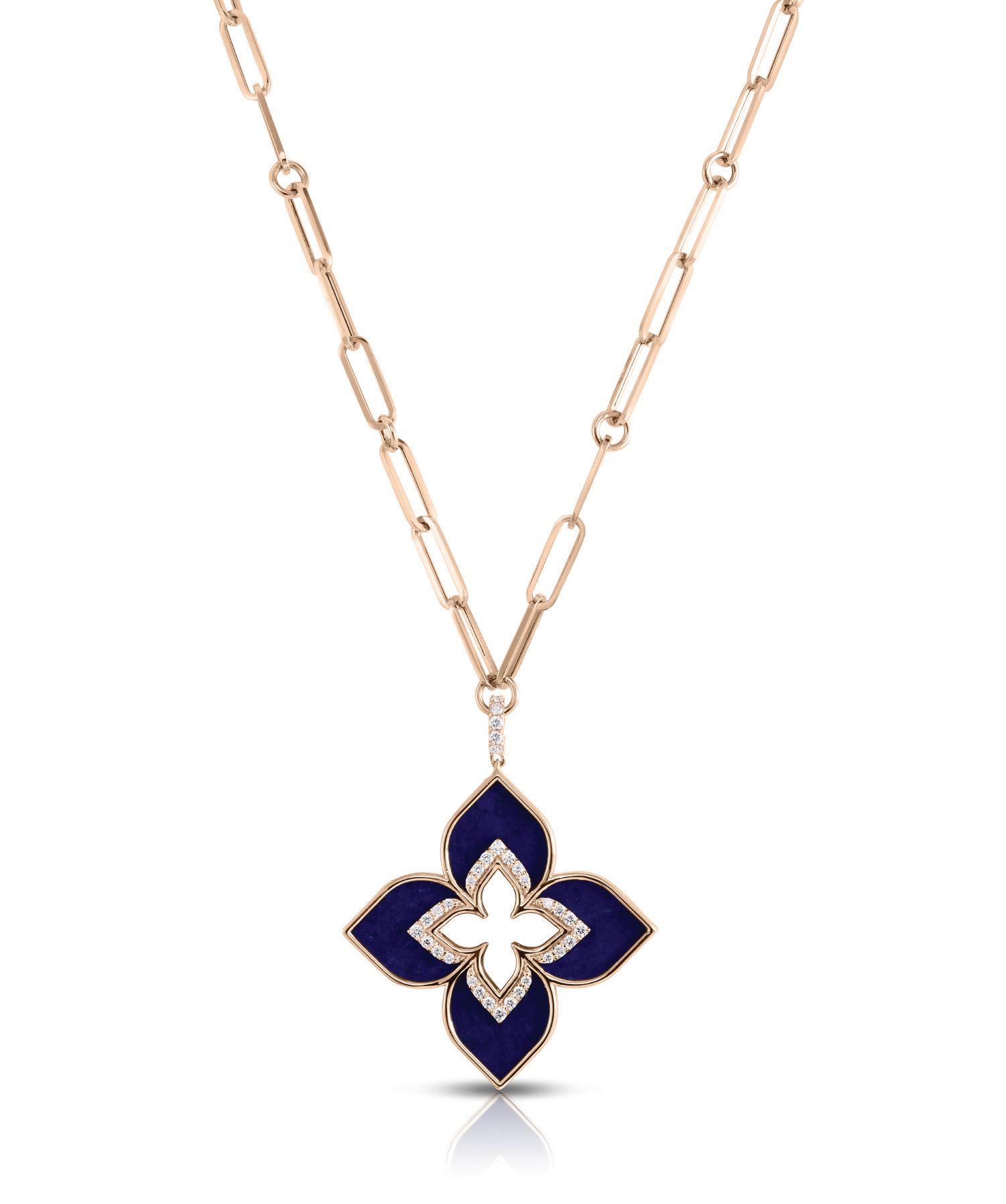 18k Rose Venetian Princess small lapis/diamond pendant and chain, $2,390; 18k Rose Venetian Princess lapis/diamond pendant on a long chain, $5,900; 18k Rose Venetian Princess small lapis/diamond earrings, $3,390; 18k Rose Venetian Princess small lapis/ diamond ring, $2,590; 18k Rose Venetian Princess lapis/diamond drop earrings, $8,500.
