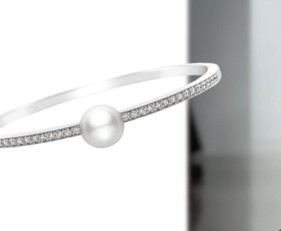 2. MIKIMOTO Classic bangle bracelet in 18K white gold with diamonds and white South Sea pearl. $12,000
