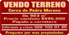 Pedro Moreno, 400 m2, next to the road, $370,000. 322 10 307-25.+