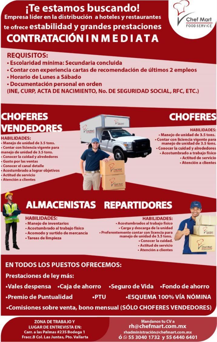 Intégrate a nuestro equipo de trabajo como chofer repartidor, mayor de 21 años, licencia de chofer, vivir cerca de la zona de Bucerías. Ofrecemos $2,100 semanales. 329 29 808-38, 322 15 986-72.+